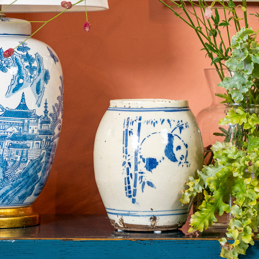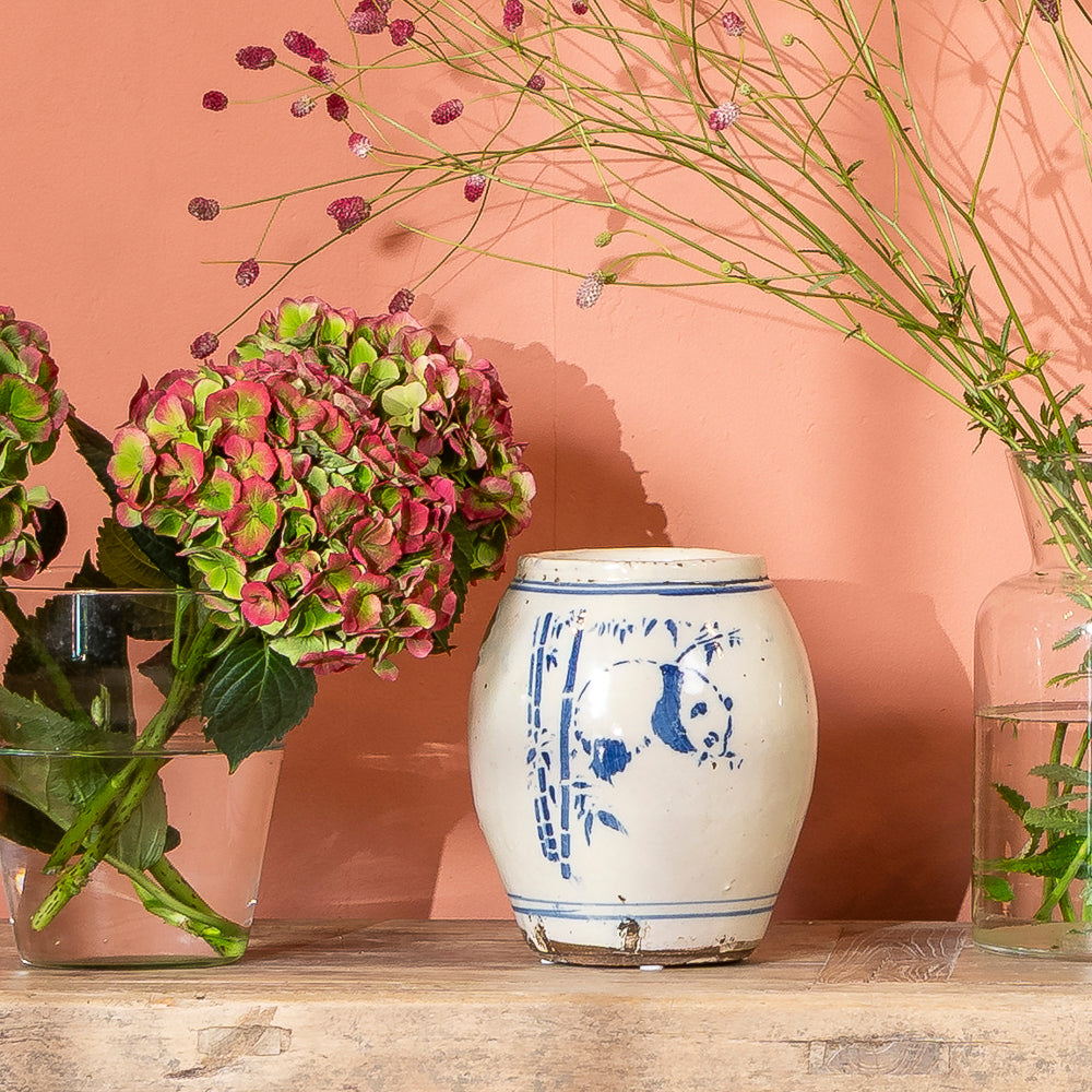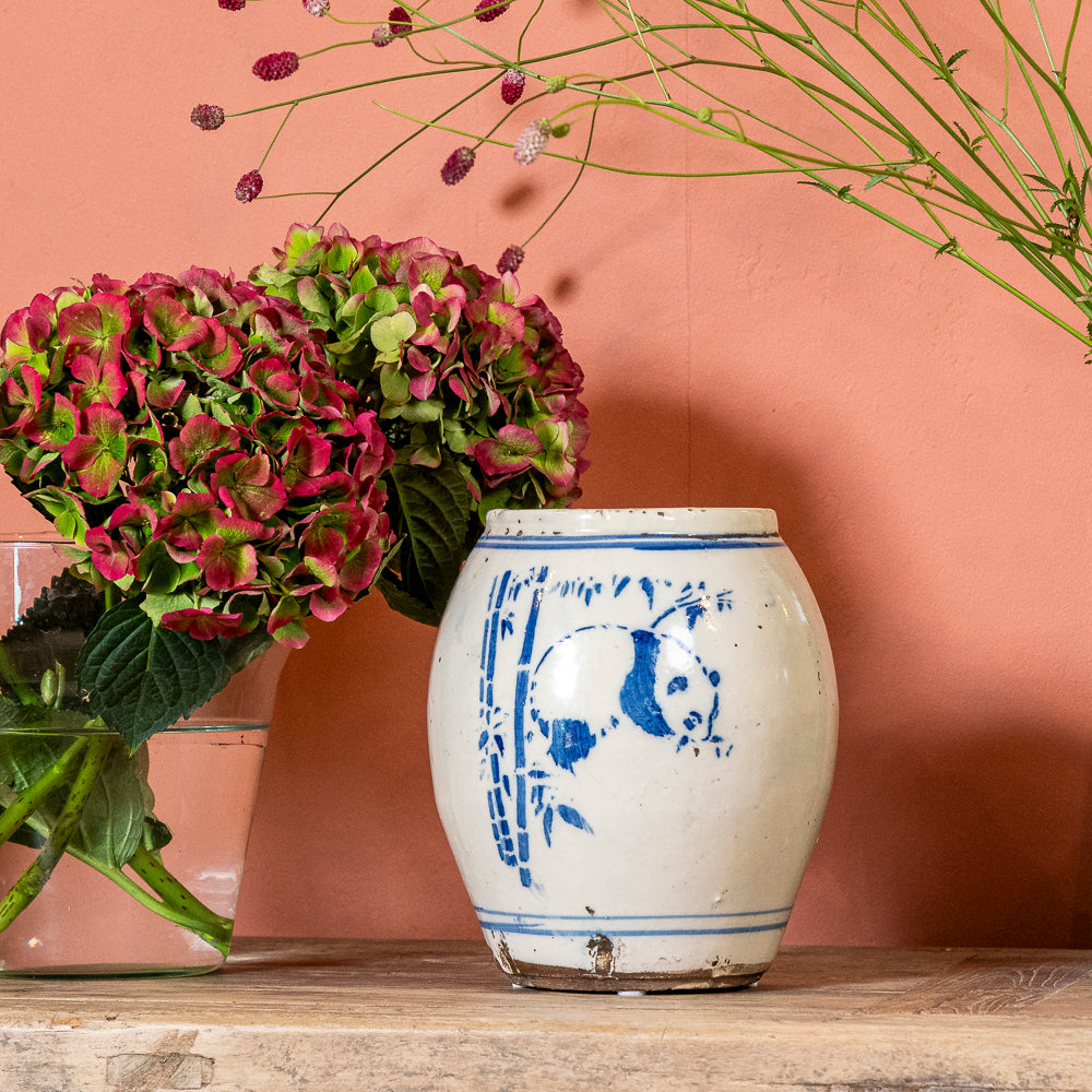 A small and charming ceramic pot from Shanxi province, China, dating to around 1940. It features a playful hand-painted blue panda on a creamy glaze.