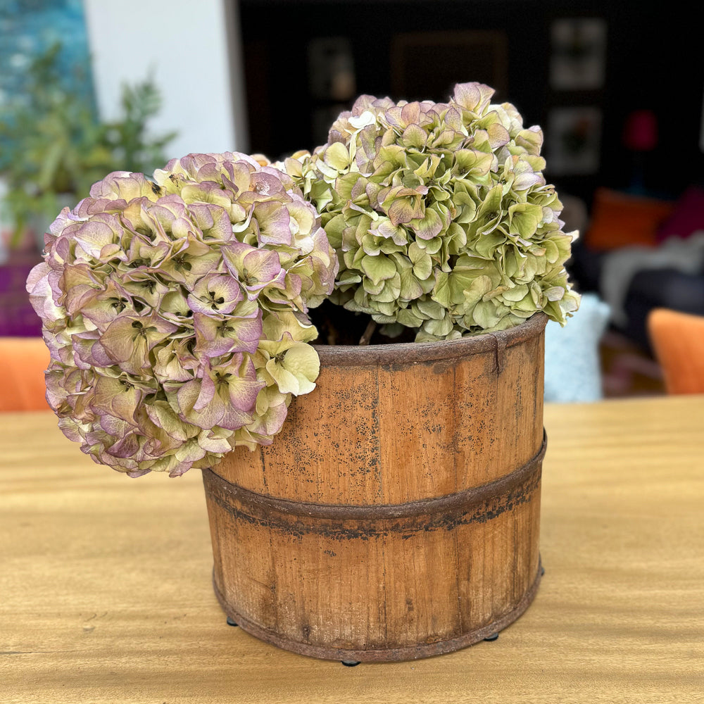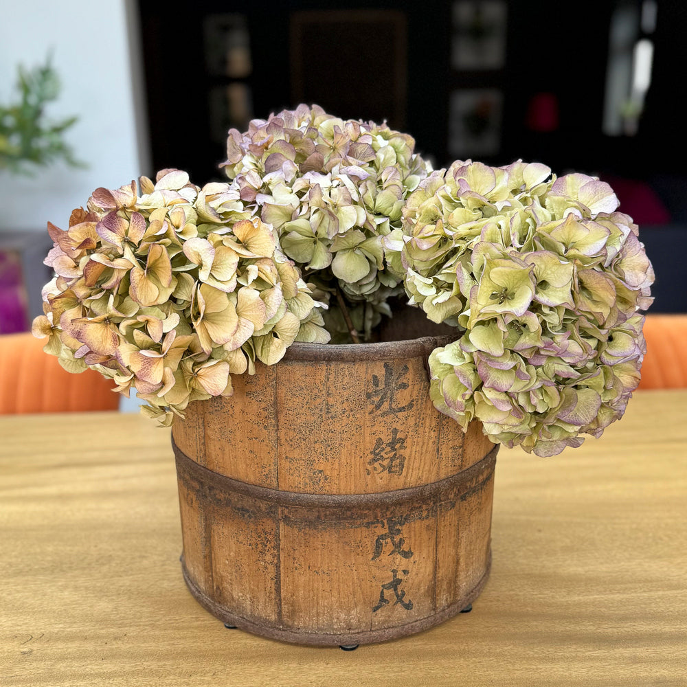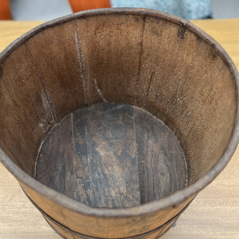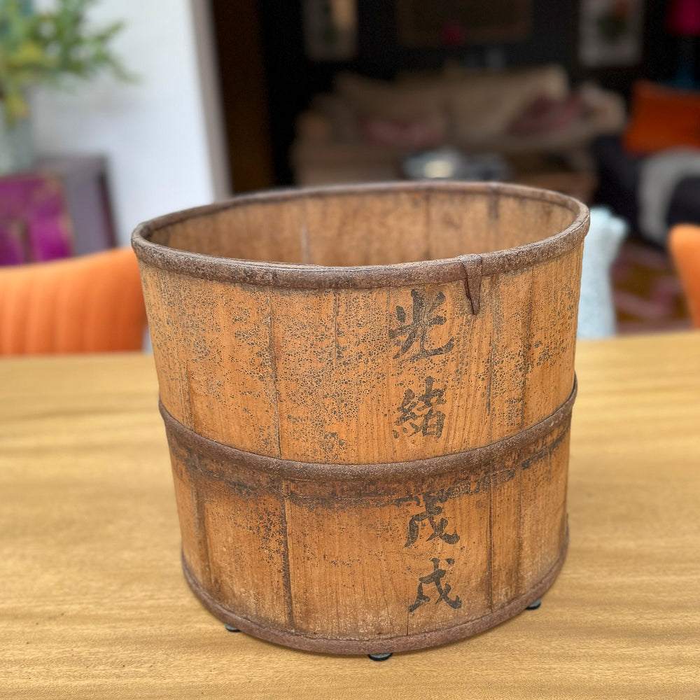 Crafted around 1920, the XIANQI Chinese Antique Bucket is a beautiful example of traditional rural craftsmanship. Made from solid wood with original iron banding, it has a warm, rich patina developed through decades of use. The bucket still bears hand-painted Chinese characters, giving it added character and historical depth.
