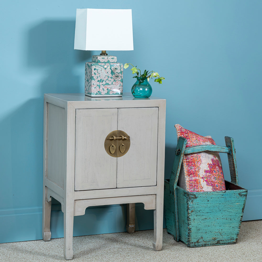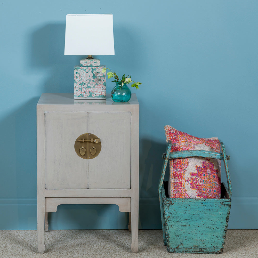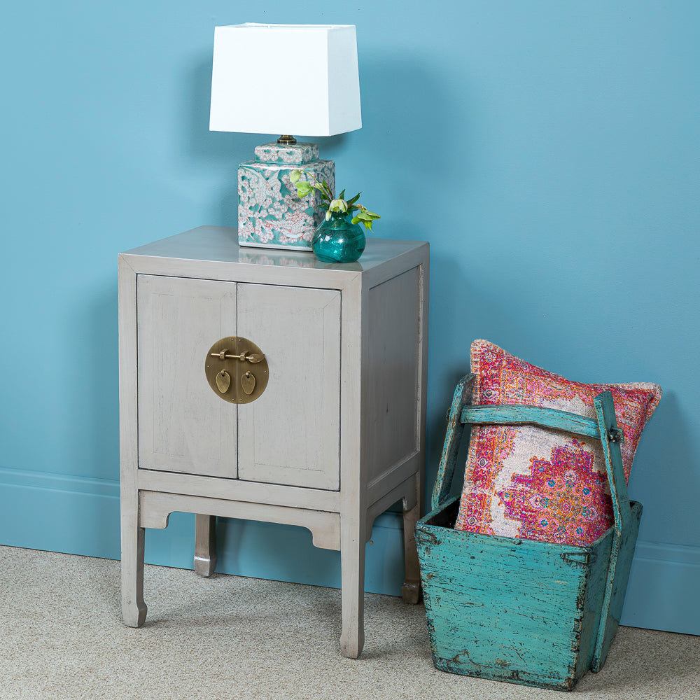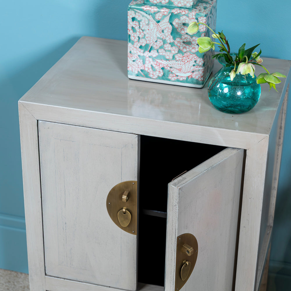 The KWAN Mink Grey Lacquer Cabinet is a beautifully handcrafted piece made from solid elm wood, finished in a soft, warm mink grey lacquer that reveals the natural wood grain beneath. The lacquer has been carefully applied to create a smooth, refined surface while allowing subtle wood tones to show along the edges — a detail that adds character and depth to the piece.
