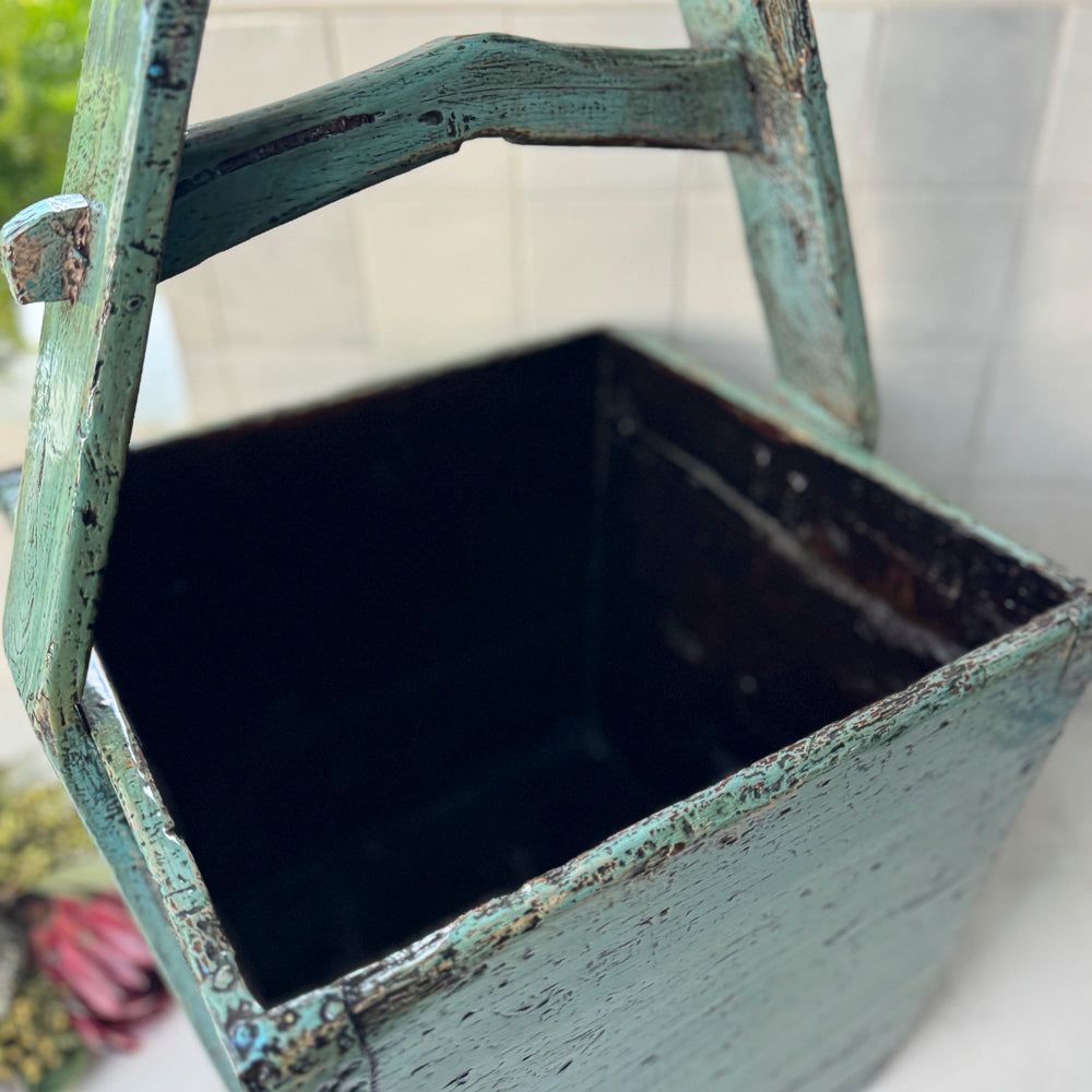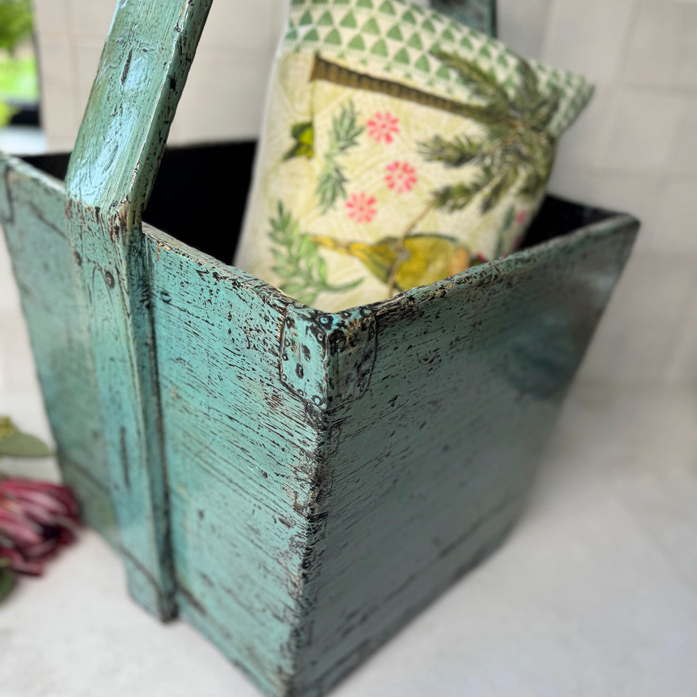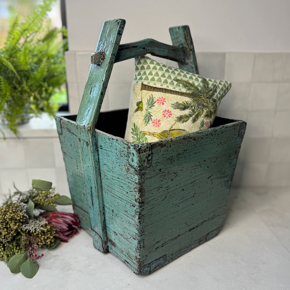 The LIAN Mist Blue Vintage Rice Basket, originally from Shandong Province, has been carefully restored to highlight its rustic character while adding a fresh lacquer finish. The soft mist blue colour carries a gentle, tranquil quality that makes it stand out as both functional and decorative.