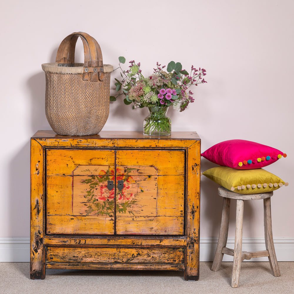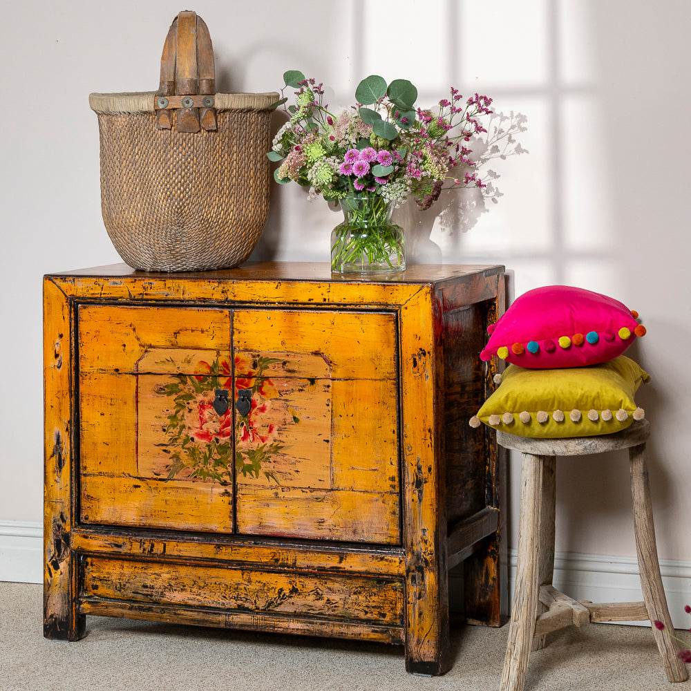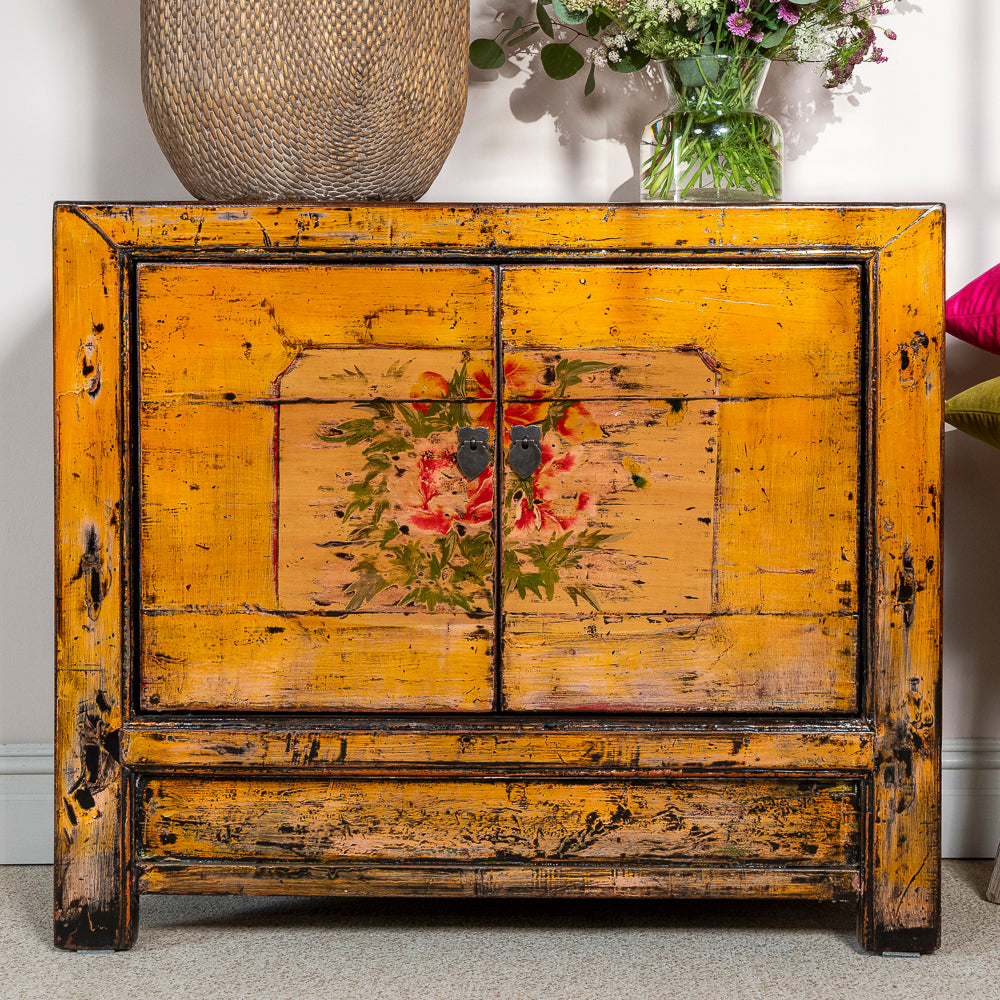 Bringing warmth and history into the home, the SAKHI cabinet is an exceptional antique from Gansu province, made around 1920 from Chinese pine. Its rich amber-yellow lacquer finish is both bold and joyful, glowing with a timeworn charm that only age and craftsmanship can achieve.