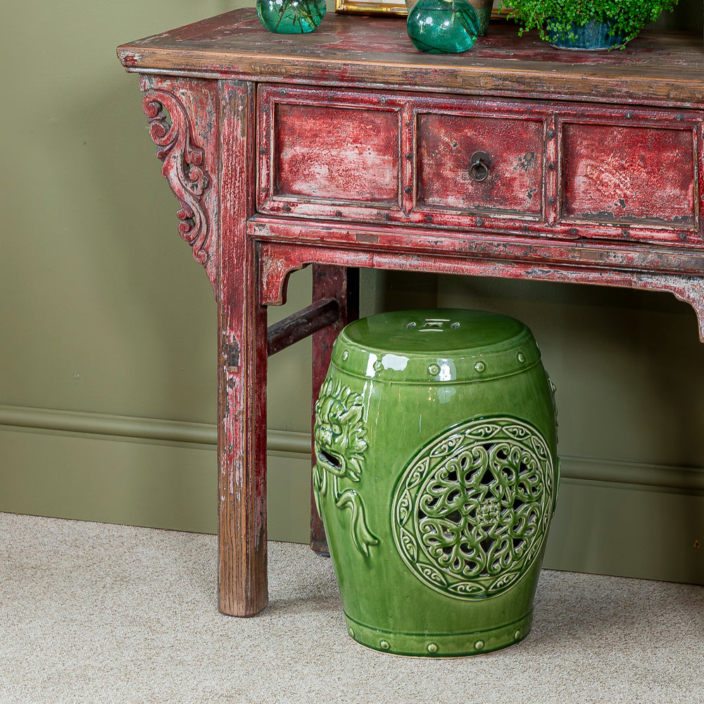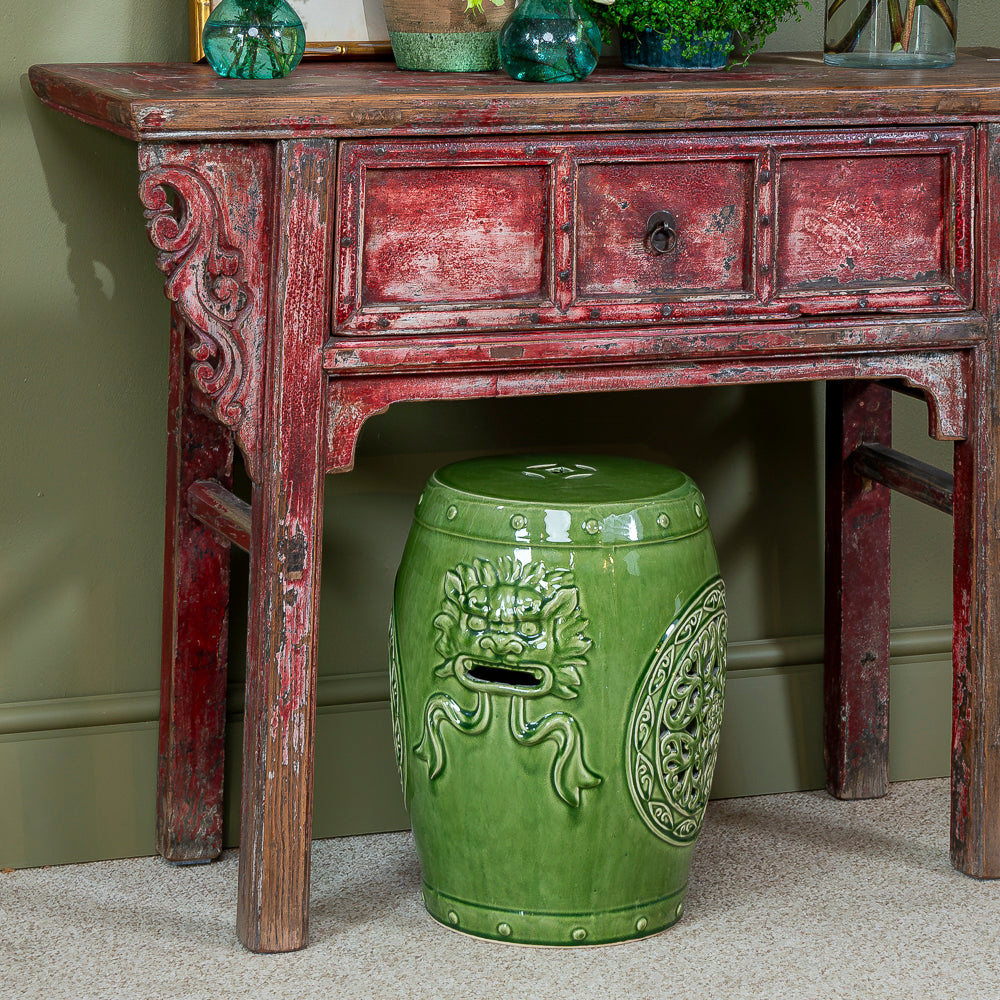 This beautiful stool is crafted from Chinese ceramic and features a vibrant green glaze with an intricate foo dog design. The foo dog symbolises protection in Chinese culture, making this stool the perfect addition to your home. Made from high-quality ceramic, it's durable and built to last.