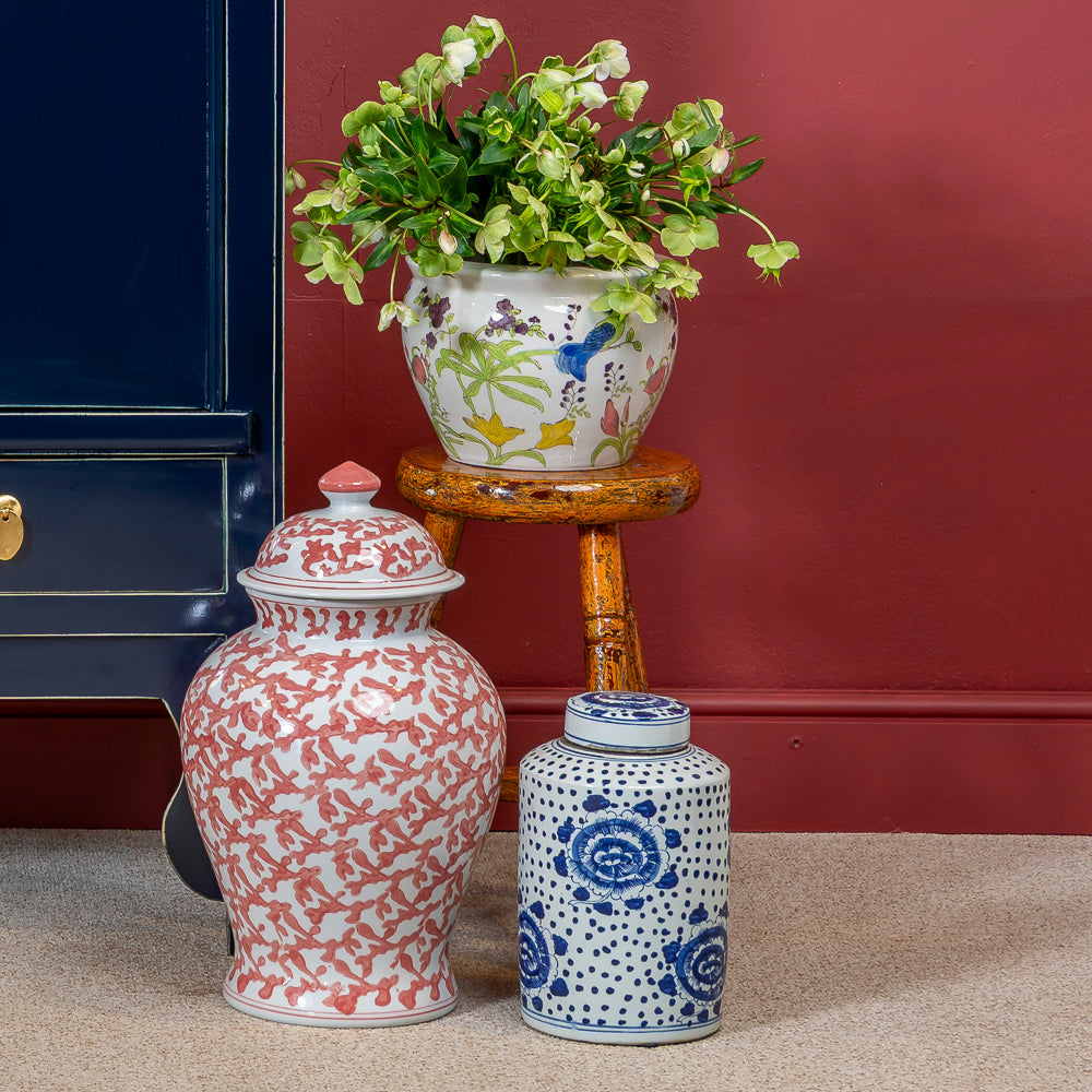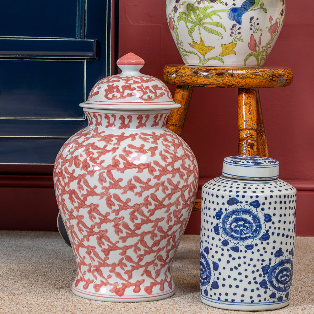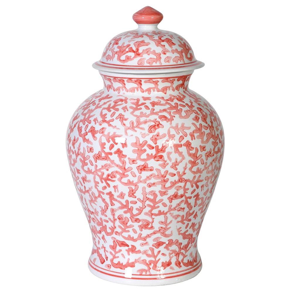 The WEI Temple Jar is a statement piece of classic oriental design with a fresh coastal charm. Standing 50 cm tall, it features a striking coral-inspired pattern in warm red tones against a crisp white glaze.