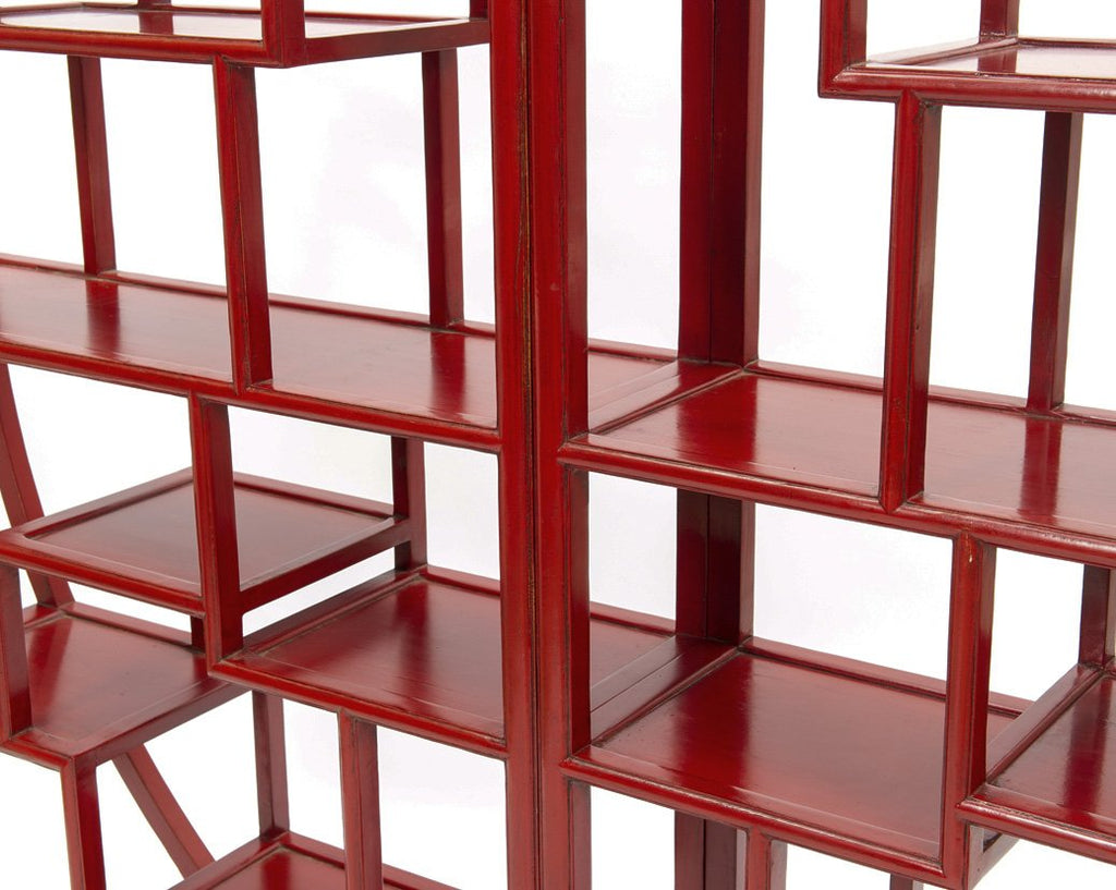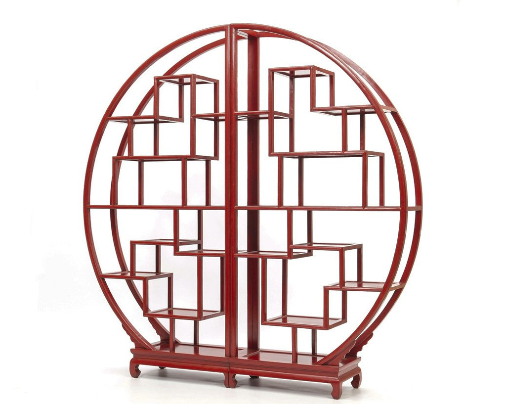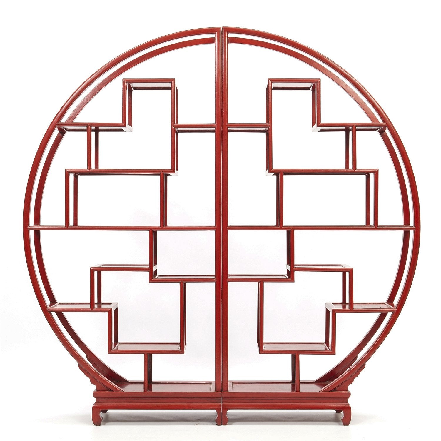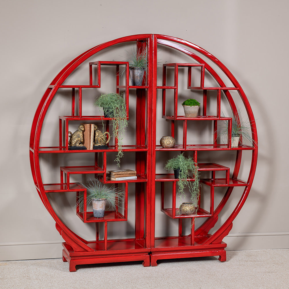 The MOONGATE Red Bookcase Room Divider is a striking statement piece inspired by the circular moon gates found in traditional Chinese gardens. Handcrafted from elm wood, it features a rich red lacquer finish that brings warmth and vibrancy to any space. The bold geometric design combines open shelving with elegant symmetry, allowing light to flow through while beautifully displaying books, ornaments, or plants.