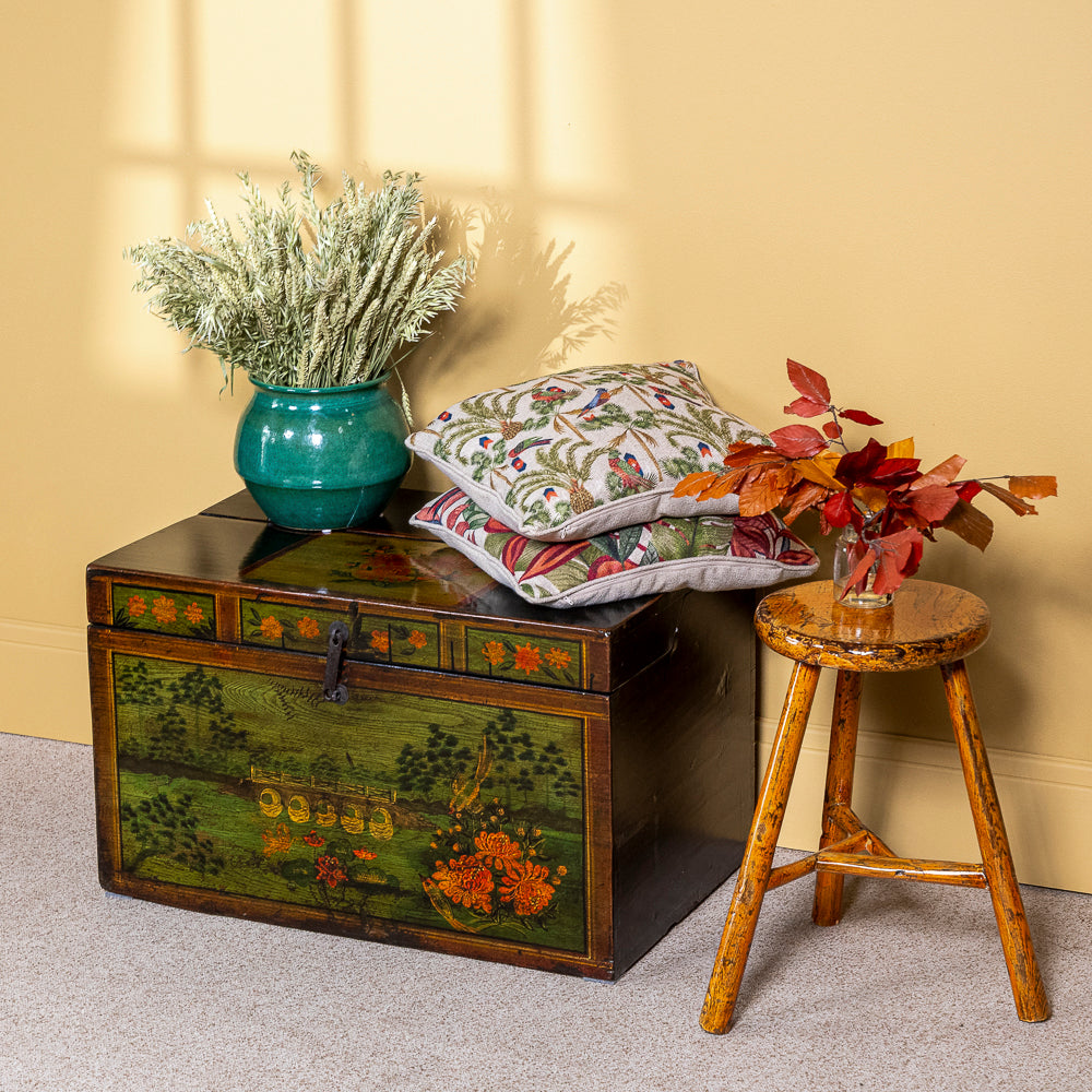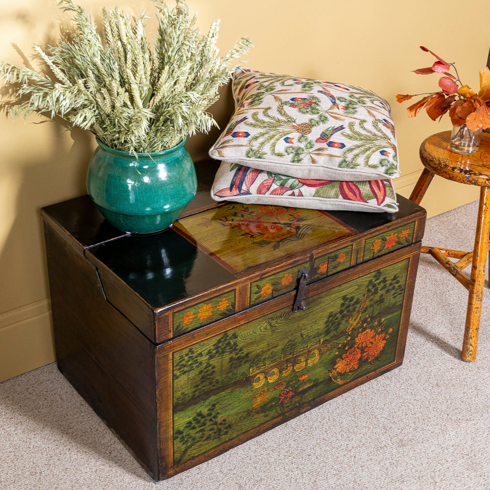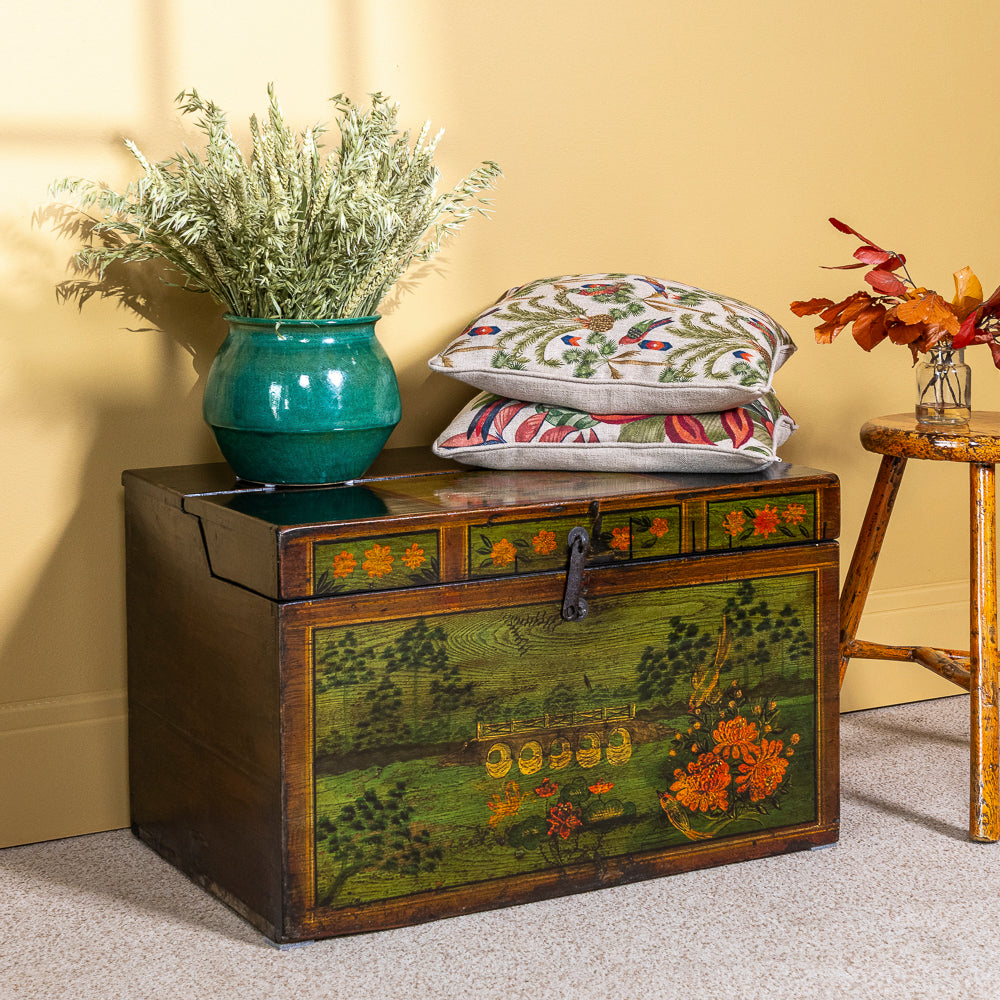A characterful antique Chinese trunk from Shandong province, hand painted in rich tones of green and red. The front panel features a peaceful riverside scene, with trees, a delicate bridge, and intricate floral motifs, symbols of harmony and natural balance. More floral decorations adorn the lid, framed by dark stained pine that brings warmth and grounding to the piece.