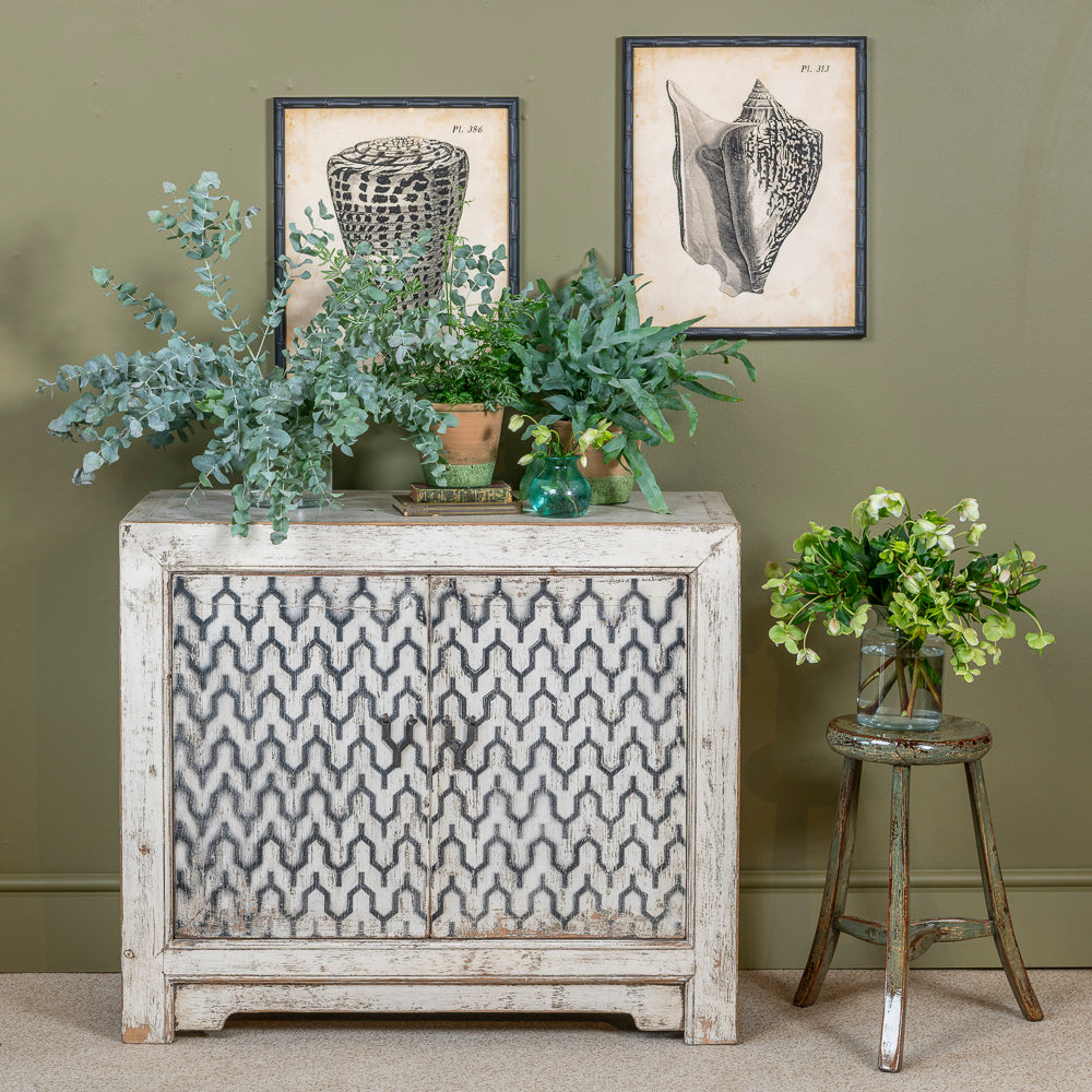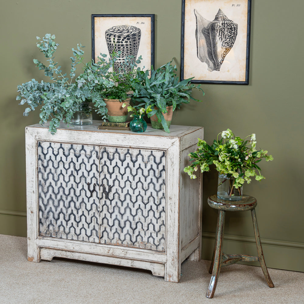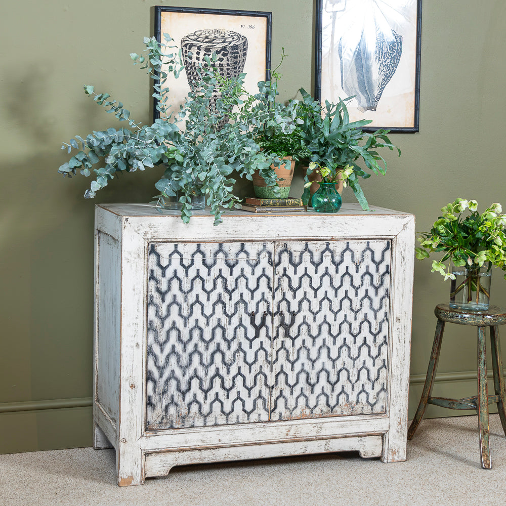 Exquisite white and black vintage cabinet, a captivating blend of timeless charm and oriental sophistication. This unique cabinet showcases a stunning contrast of black and white finishes, giving it a classic and elegant appeal. With its distressed look, it exudes a touch of vintage allure that complements any interior design style.