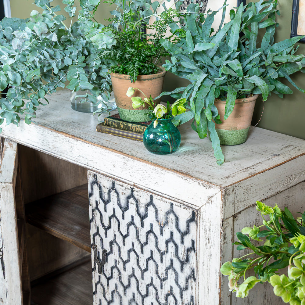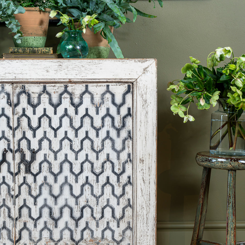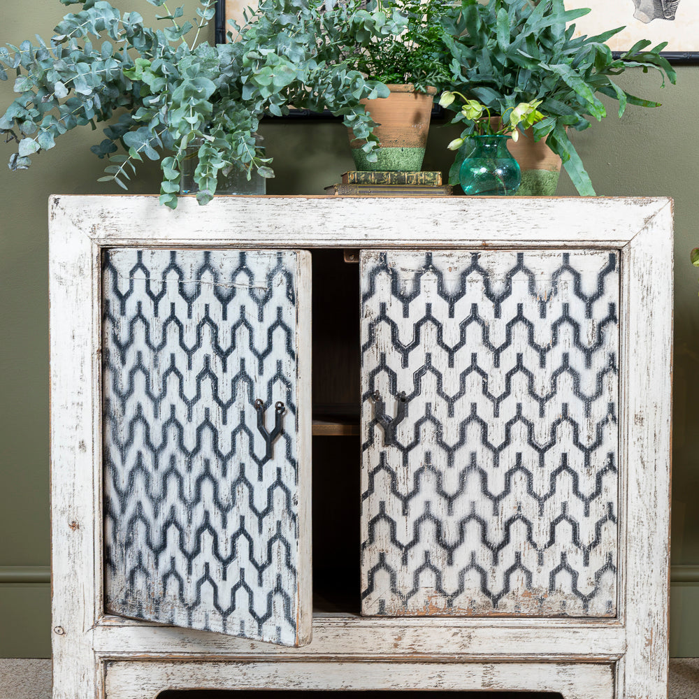 Crafted with attention to detail, this cabinet features an enchanting oriental geometrical pattern on the double doors, adding an artistic and cultural essence to your living space. The brass handles add a luxurious touch, making it easy to access the storage space inside.