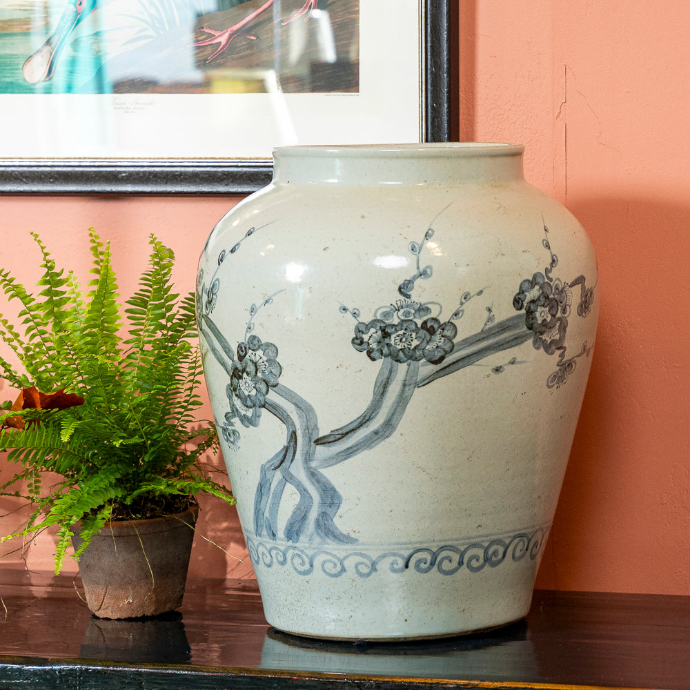 The HONGHE Large Ceramic Floral Urn is a beautiful statement piece, hand-painted with soft blue florals and scrolling detail. Made entirely by hand, its subtle imperfections and aged finish add character and charm.