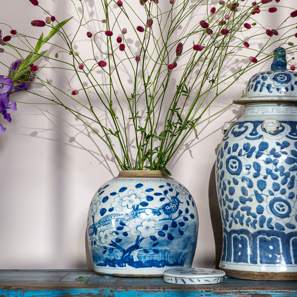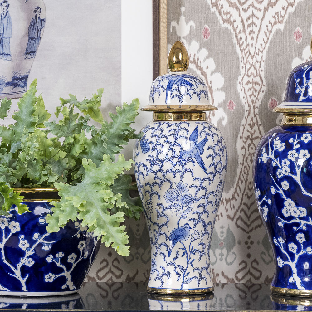 Browse our collection and you’ll notice the differences between the two types of the jar. Ginger jars are typically round and squat with flattish lids. Temple jars are more elongated and vase-like in shape, with pointed ornamentation on the lids. Blue and white ceramic is the most familiar and popular, though you may also find a ginger jar in white or vivid colours. Our Chinese temple jars and ginger jars are handmade and hand-painted, often depicting floral motifs, landscapes, village scenes, cedar trees or birds.