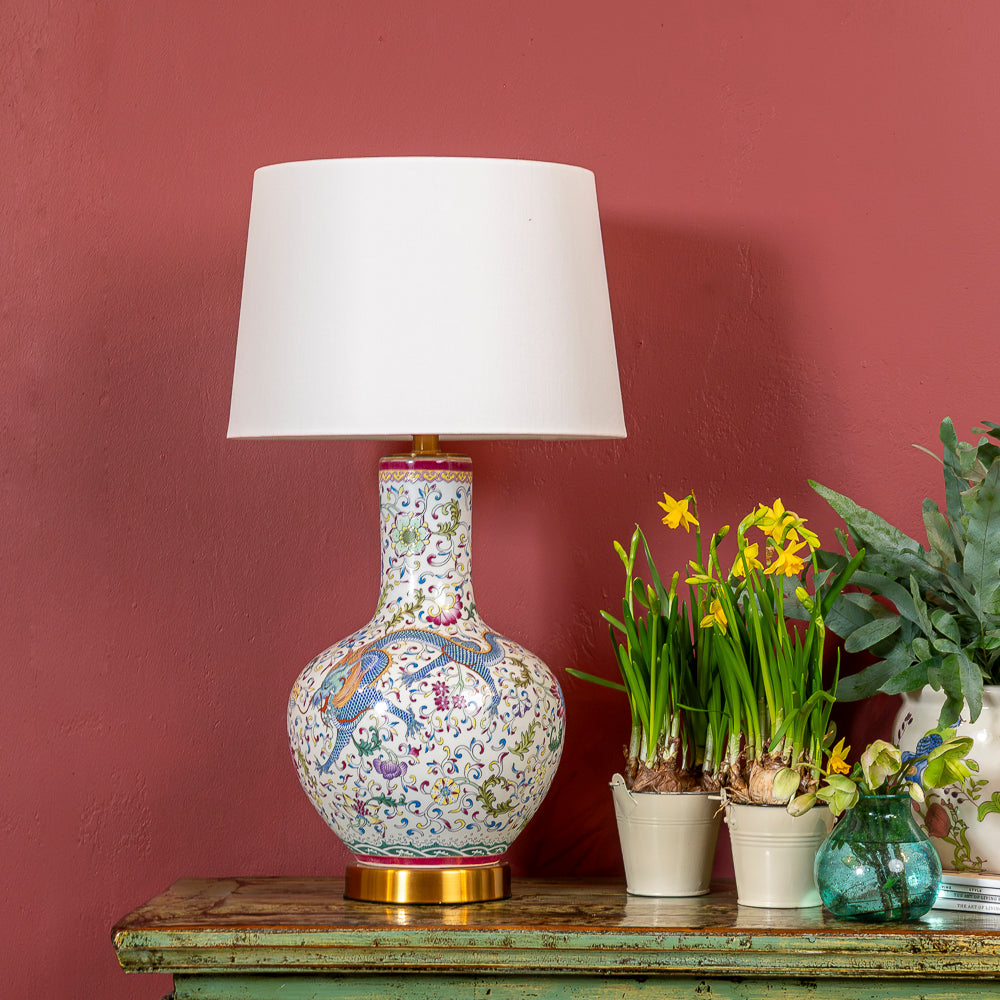Bright, colourful, and full of character, the LUAN Phoenix Porcelain Table Lamp is crafted from fine porcelain and hand-painted with lively phoenix and dragon motifs. The swirling floral patterns and bold shades of blue, green, red, and gold bring out the charm of traditional Chinese design while keeping it fresh and vibrant. Resting on a polished brass base and topped with a simple white shade, it has the perfect mix of detail and balance.