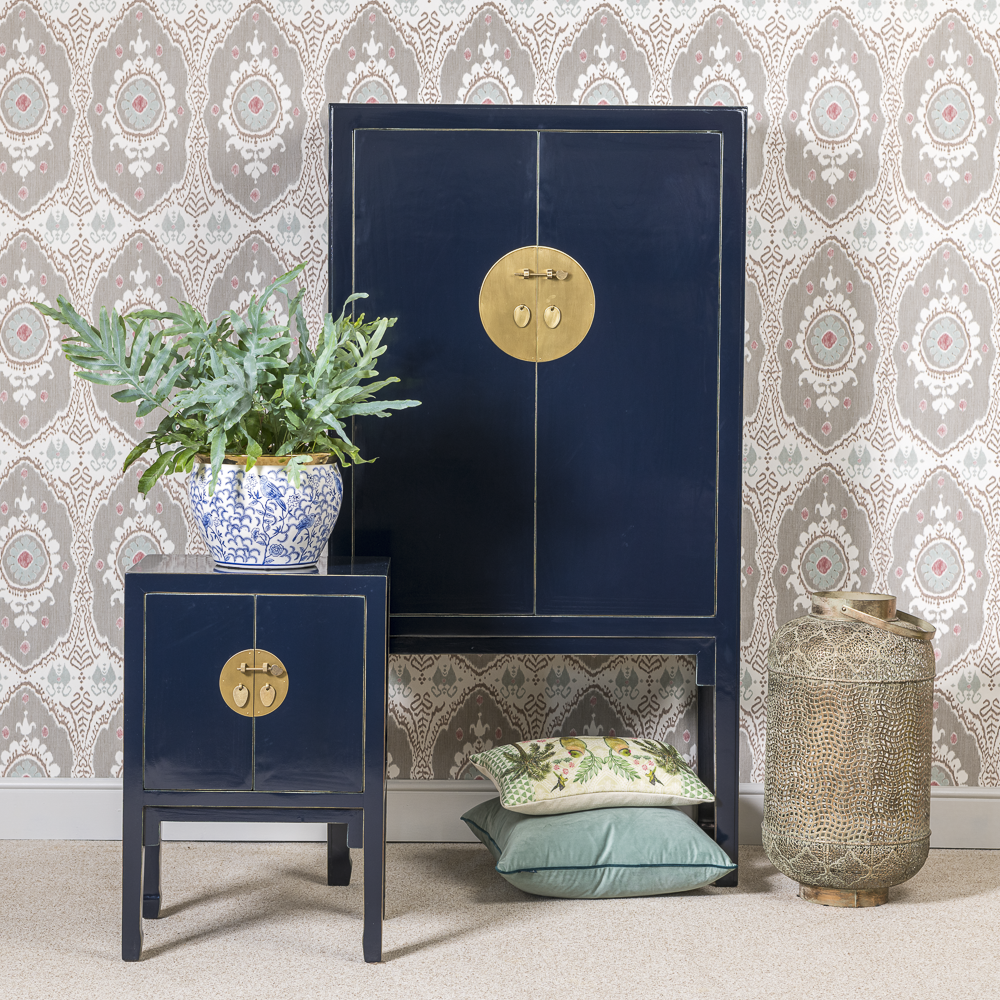 Introducing the stunning Tall Chinese Cabinet, a versatile piece designed to make a bold statement in every room of your home. With its rich deep blue Indigo lacquer and glamorous gold hardware, this cabinet effortlessly combines functionality with luxury, elevating your interior design to new heights.