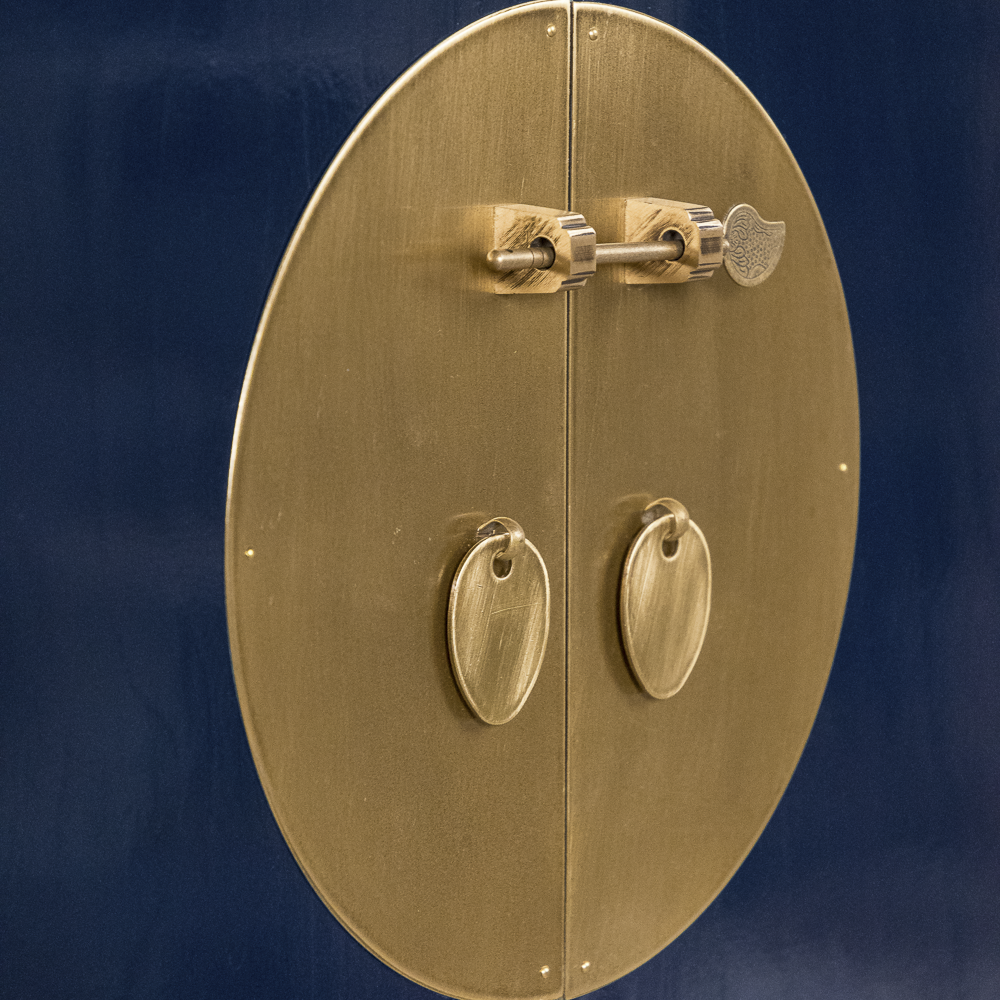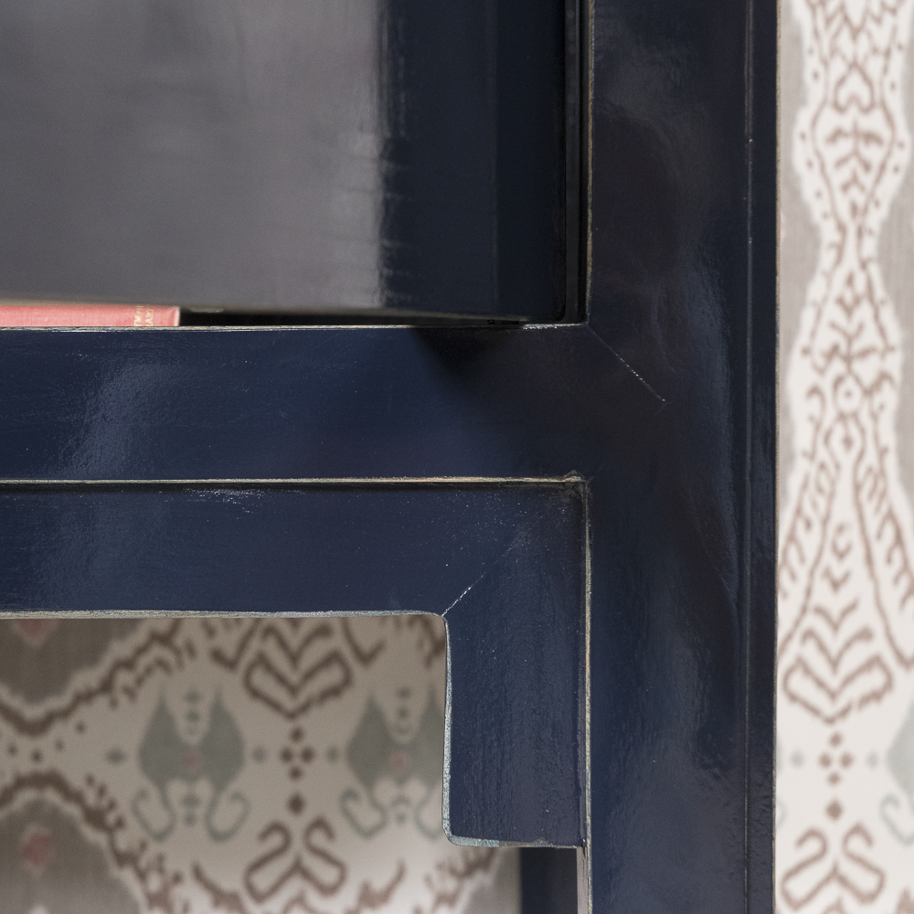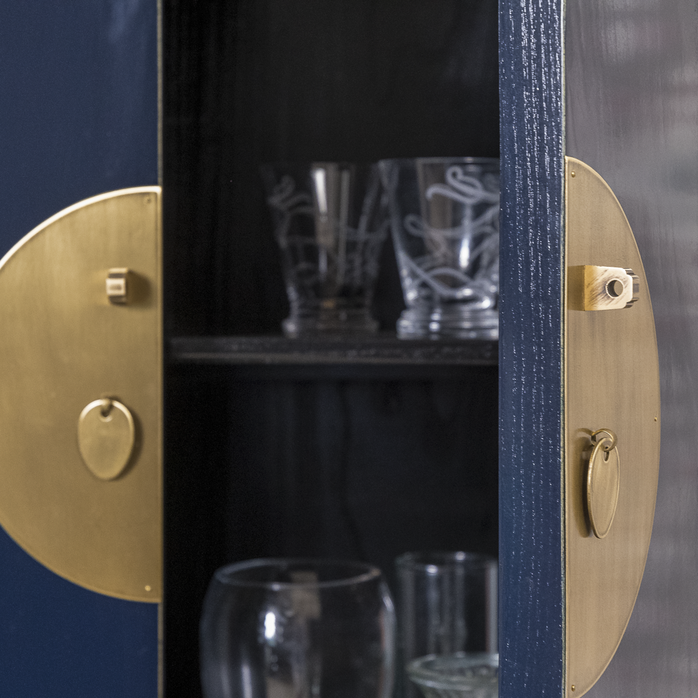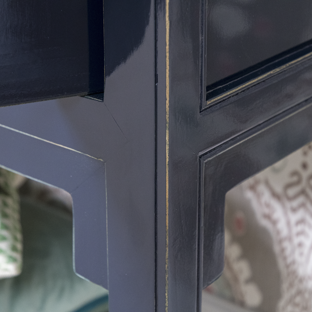 The deep indigo lacquer, a stunning shade of blue, comes to life when touched by natural daylight, adding depth and richness to any space. Whether used in the living room, kitchen, or hallway, this cabinet also makes an excellent cocktail or drinks cabinet, perfect for entertaining in style.