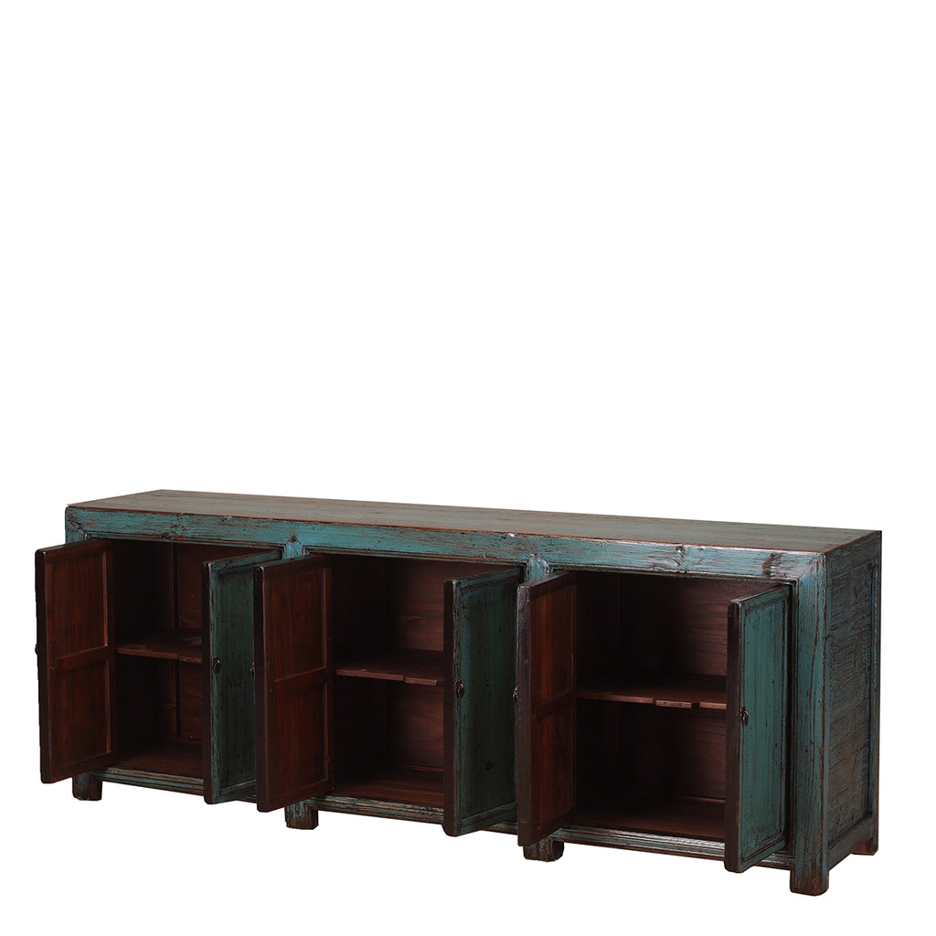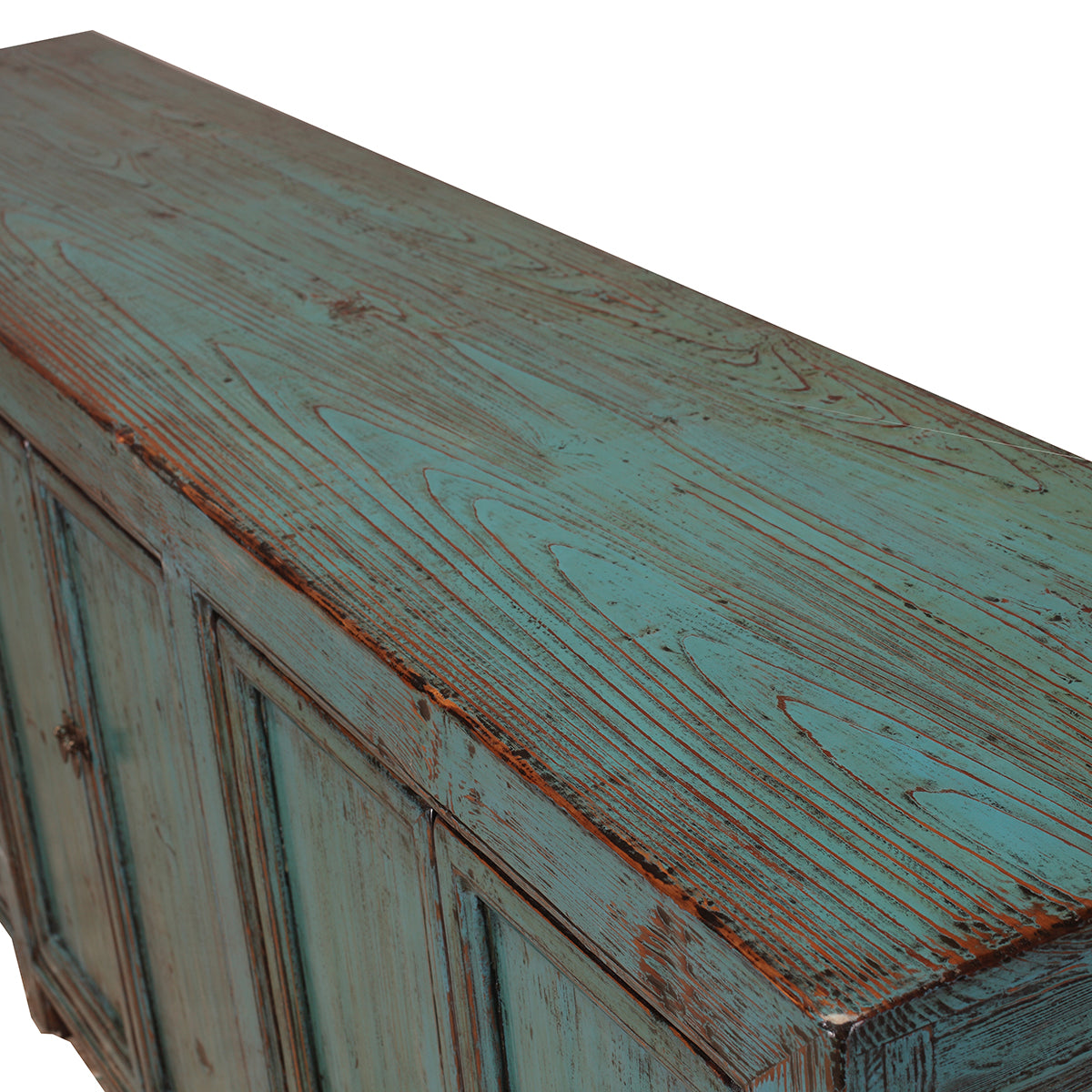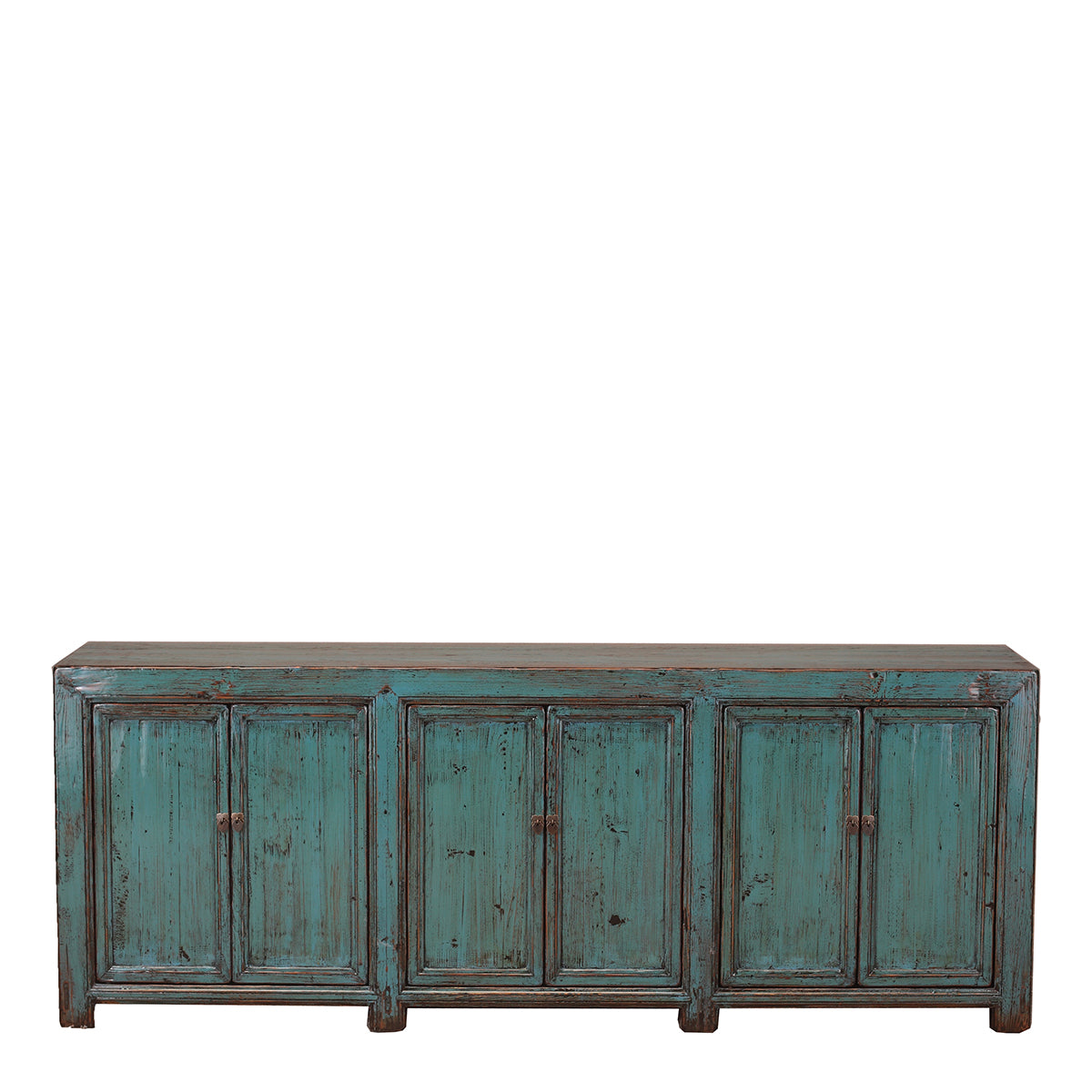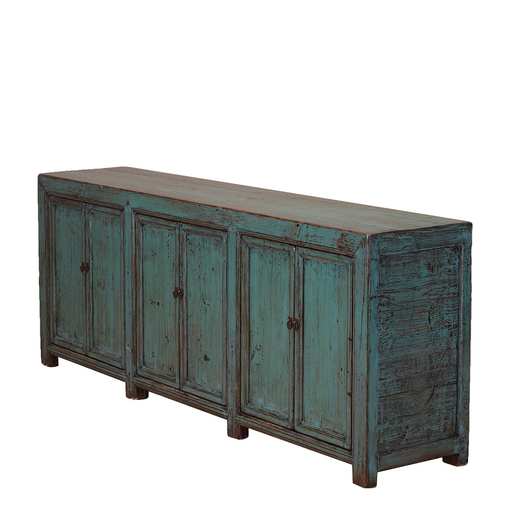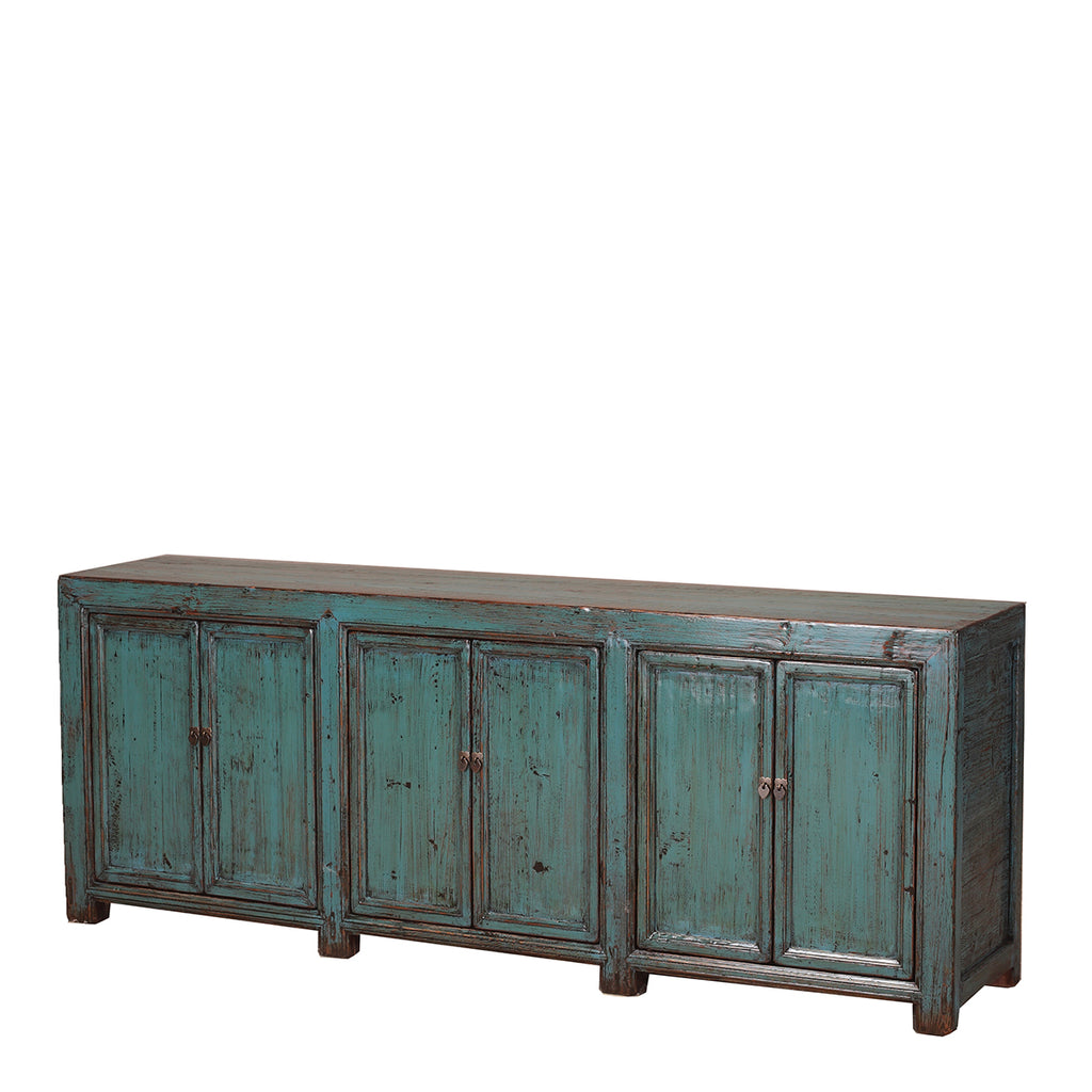 The LONGTANG Turquoise Lacquer Long Sideboard is a beautifully crafted piece made from reclaimed Chinese pine, finished using traditional techniques. The hand-applied turquoise lacquer has been gently distressed to reveal touches of the natural wood beneath, giving the piece a sense of history and character.