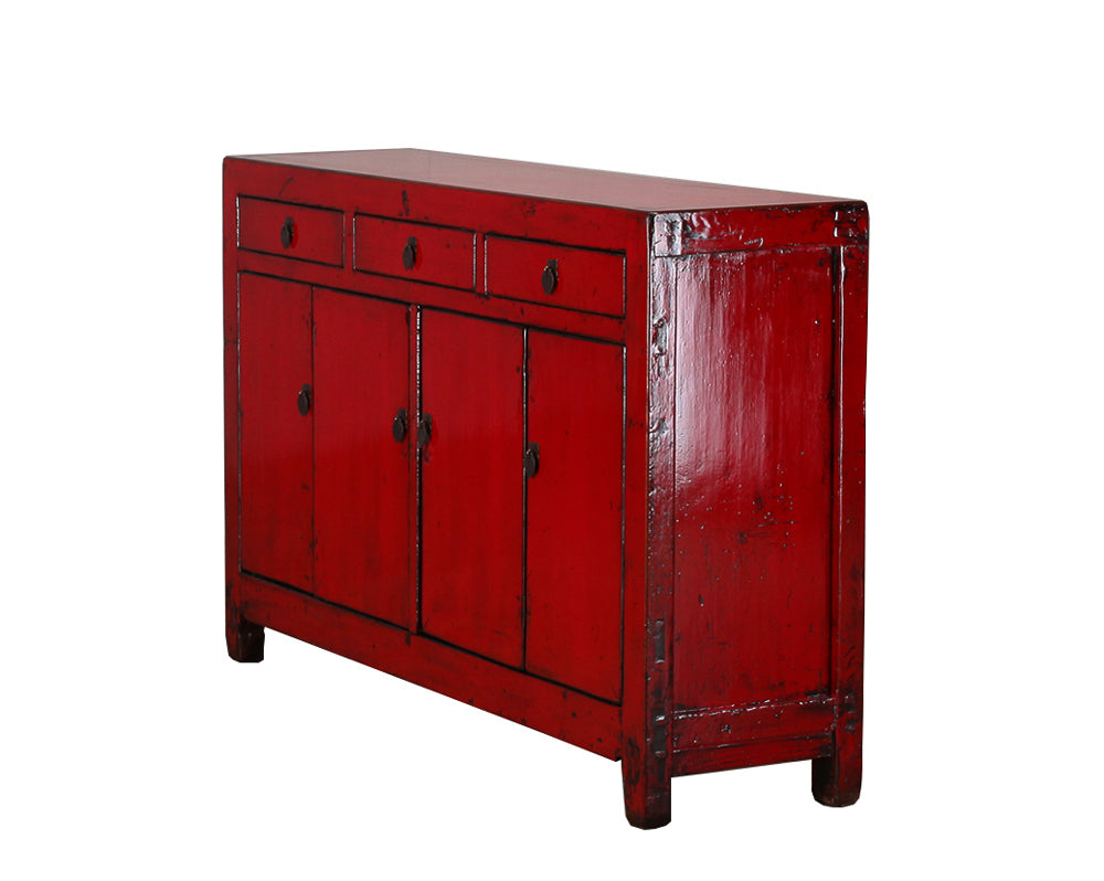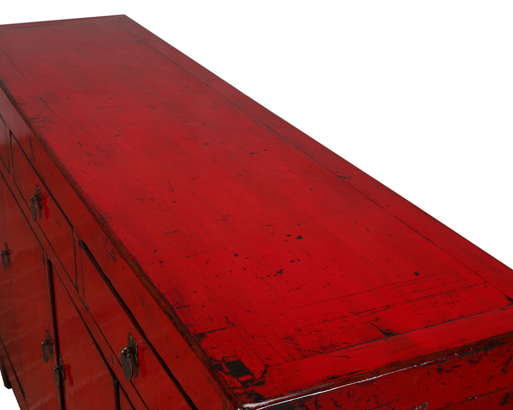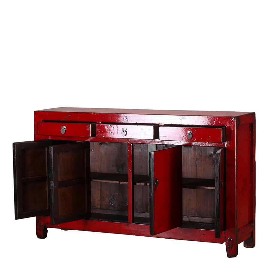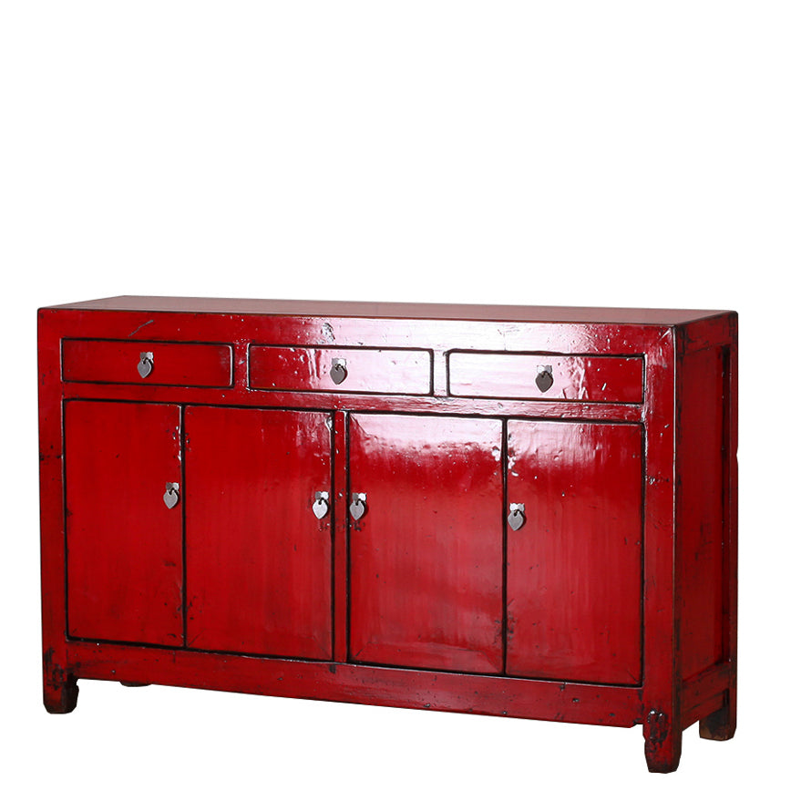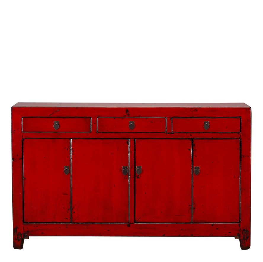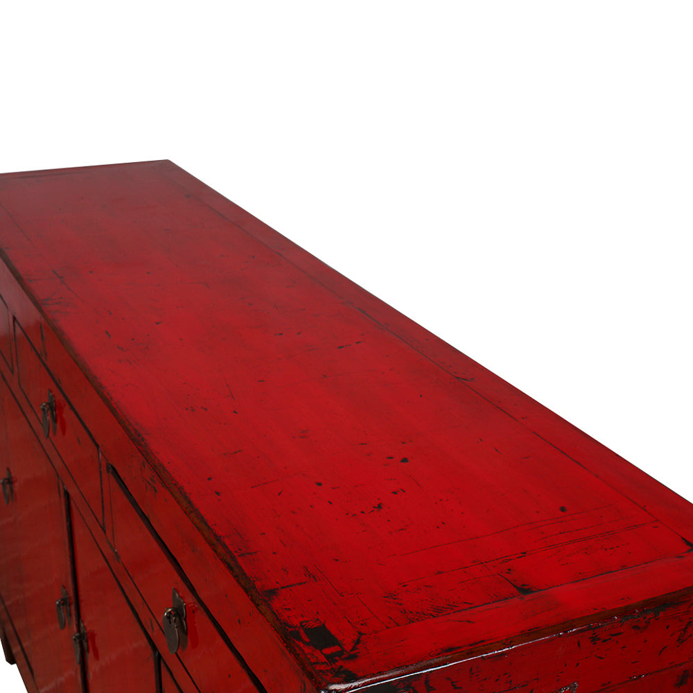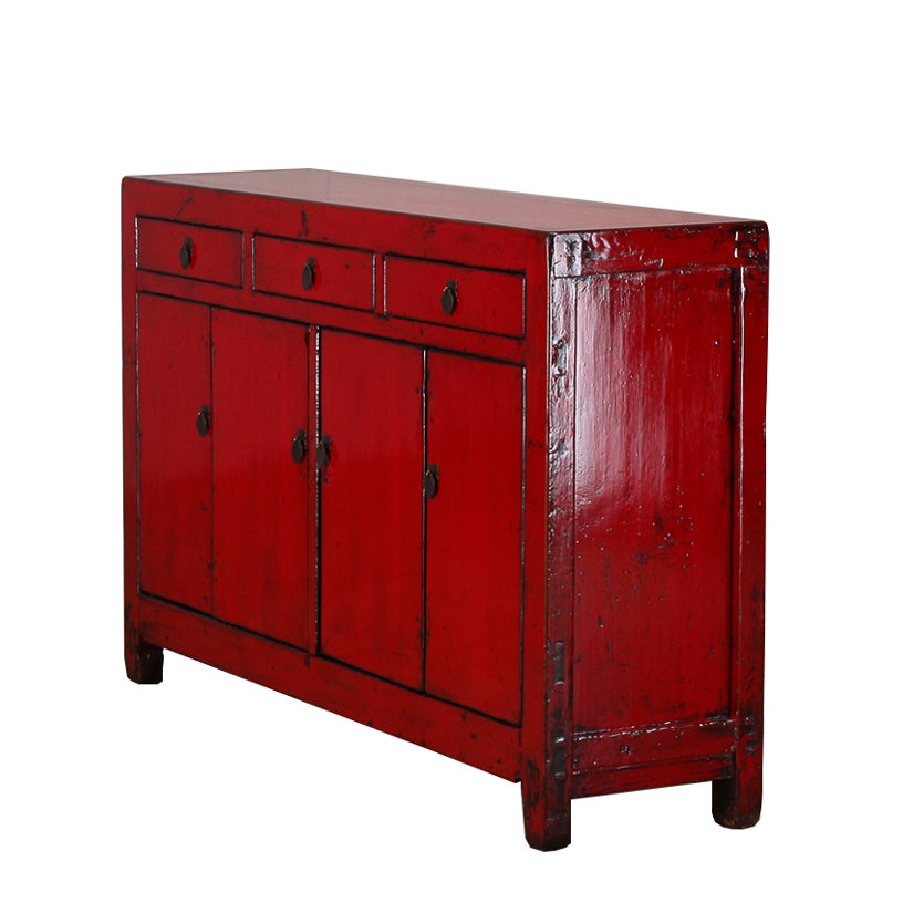 The HONG Chinese Antique Sideboard is a striking early 20th-century piece, crafted in Dongbei Province around 1920. Its bold, lacquered red finish symbolising joy, luck, and protection in traditional Chinese culture, immediately captures attention, while the patina and natural wear offer a rich sense of age and authenticity. Made from Chinese pine, this cabinet features original metal hardware and four cupboard doors beneath three drawers, all arranged in a highly practical configuration.