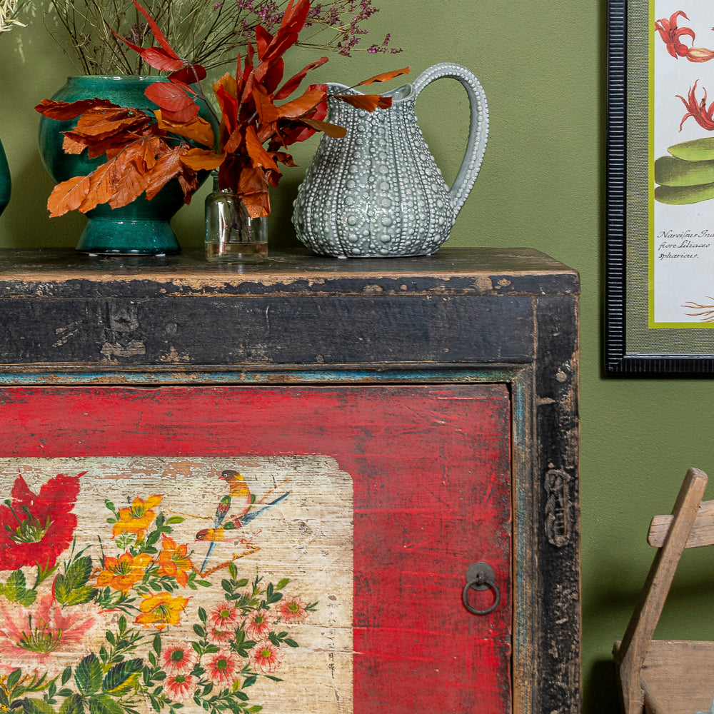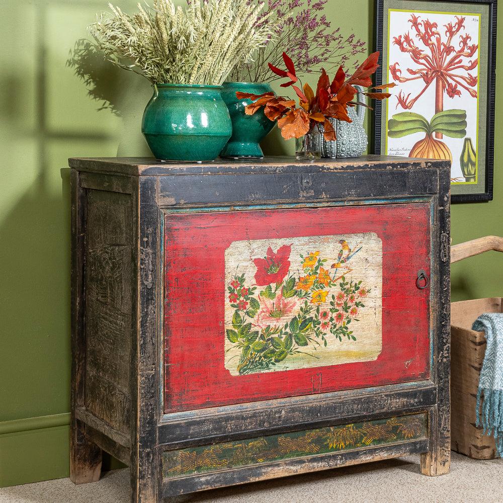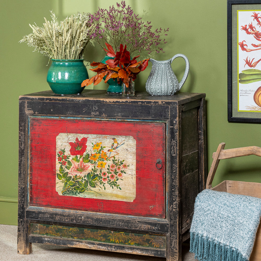 Ideal for storage or as a feature cabinet in hallways, living rooms, or bedrooms, this antique Chinese cabinet offers practical versatility paired with rich visual texture. The hand-painted door panel introduces charm and depth, while the compact size makes it perfect for smaller spaces. The cabinet opens to a removable shelf for convenient organisation.