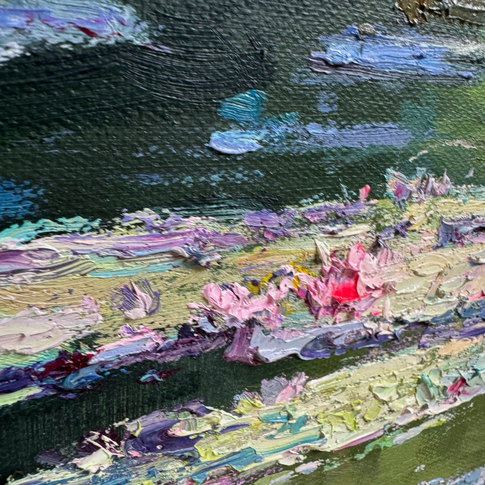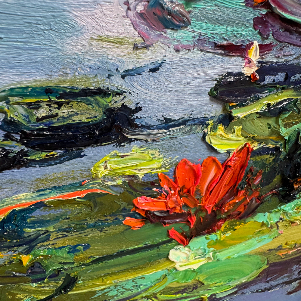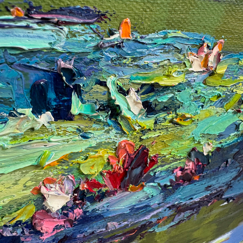 STILLNESS by Tian Lu captures a peaceful moment on the water, where soft reflections, floating lilies, and dappled light come together in a harmonious scene. Gentle greens, blues, and touches of warm colour create a sense of calm that instantly soothes the eye. Painted in textured oil, the surface has depth and movement, giving the landscape a beautifully lifelike quality.