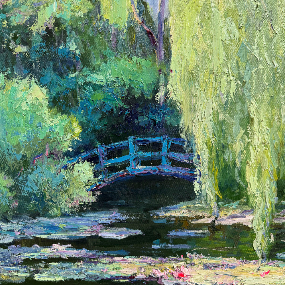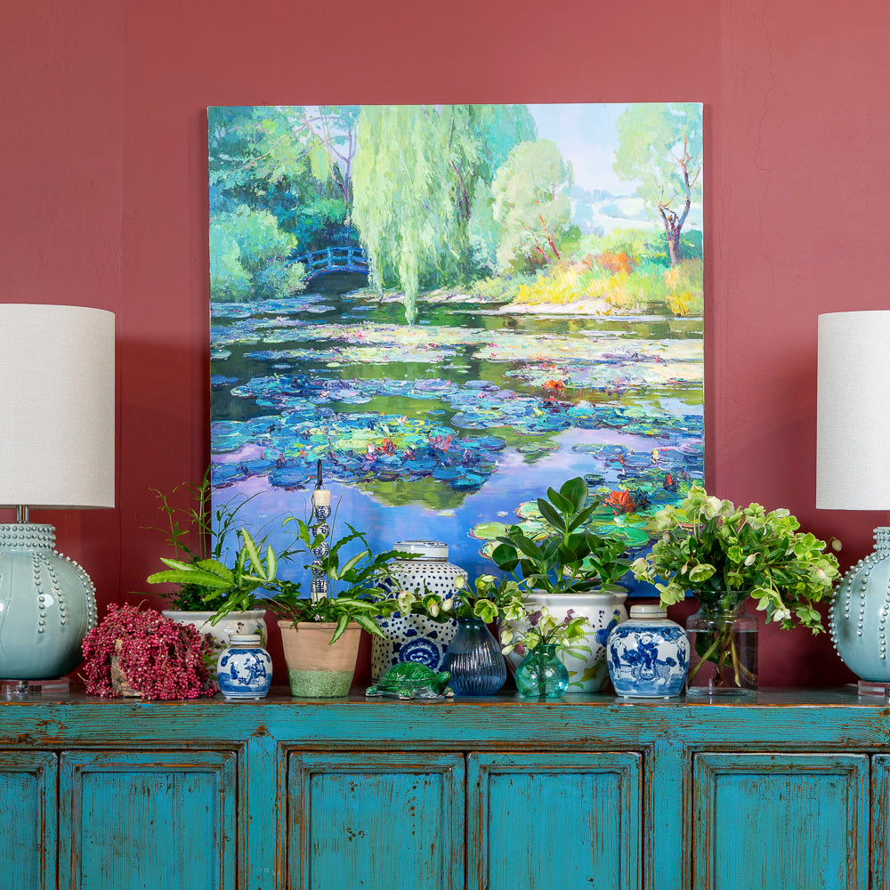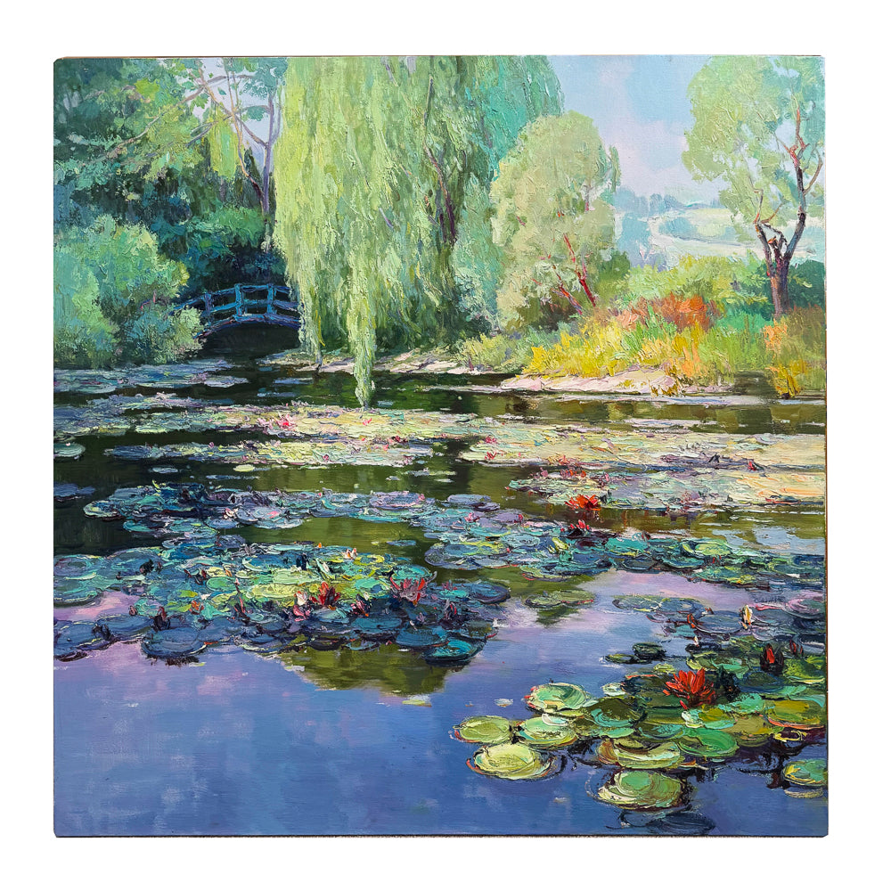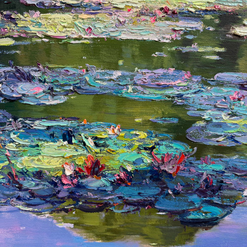 STILLNESS by Tian Lu captures a peaceful moment on the water, where soft reflections, floating lilies, and dappled light come together in a harmonious scene. Gentle greens, blues, and touches of warm colour create a sense of calm that instantly soothes the eye. Painted in textured oil, the surface has depth and movement, giving the landscape a beautifully lifelike quality.