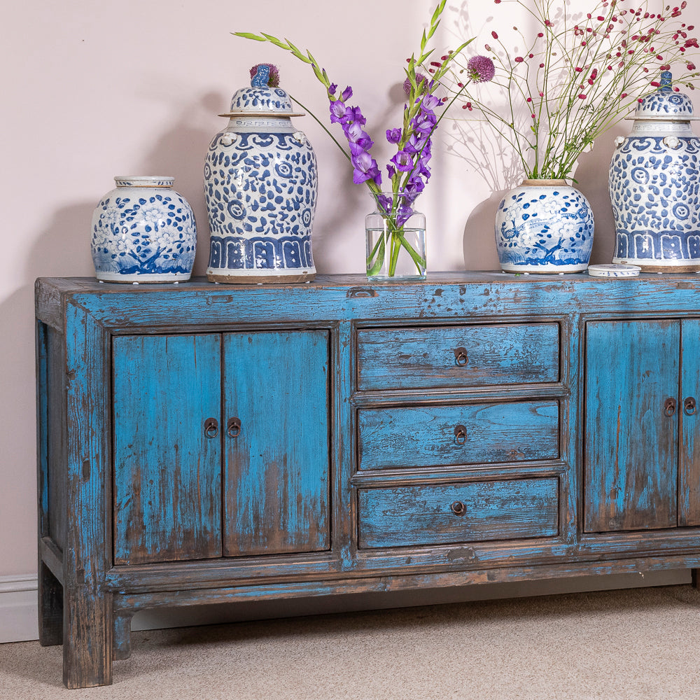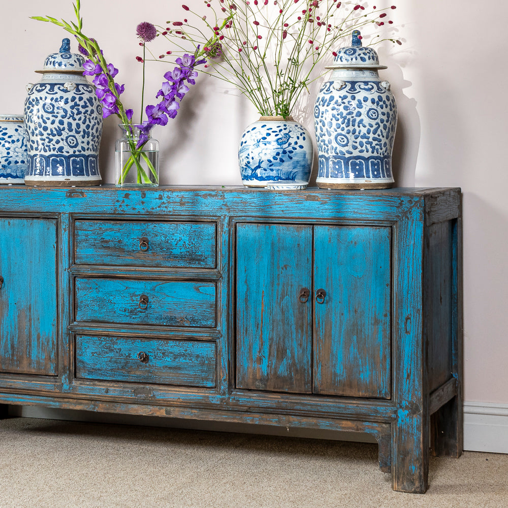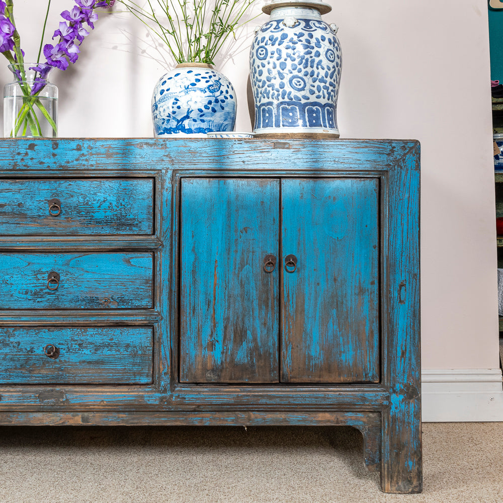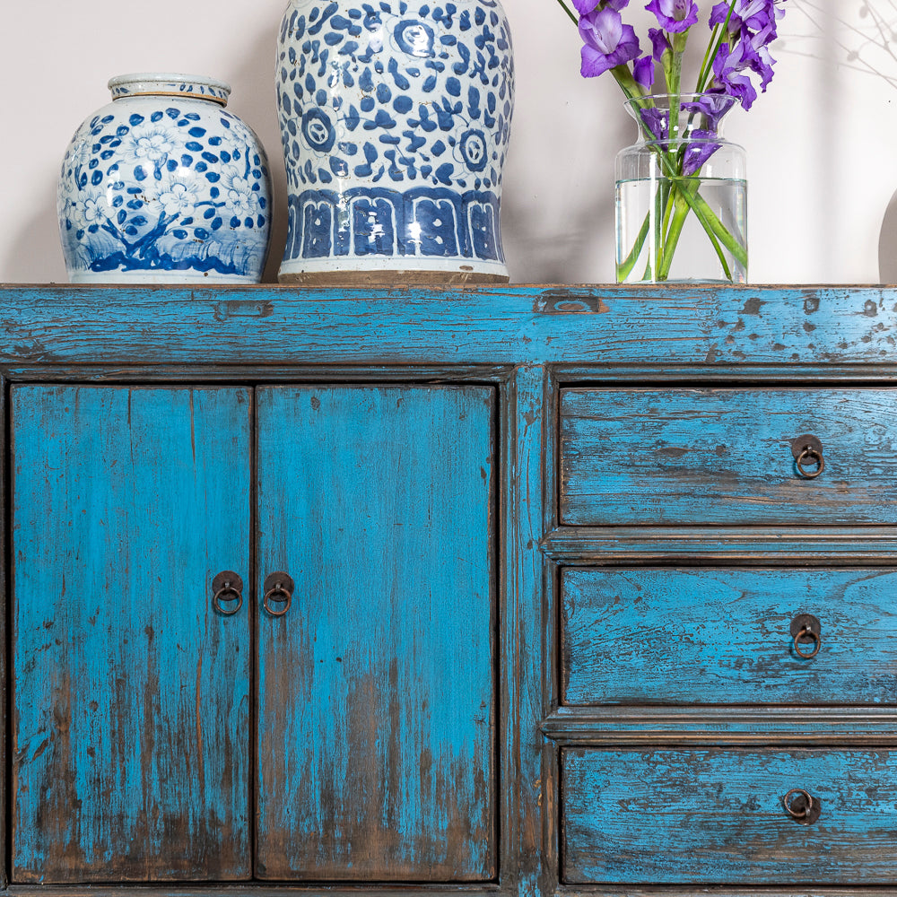 The CHYOU blue distressed sideboard, crafted in Gansu province around 1920, is a bold and beautifully textured piece full of character and charm. Its matt electric blue finish, layered with rich patina and age, reveals the grain of the old wood beneath, offering a striking blend of texture and depth that draws the eye immediately.