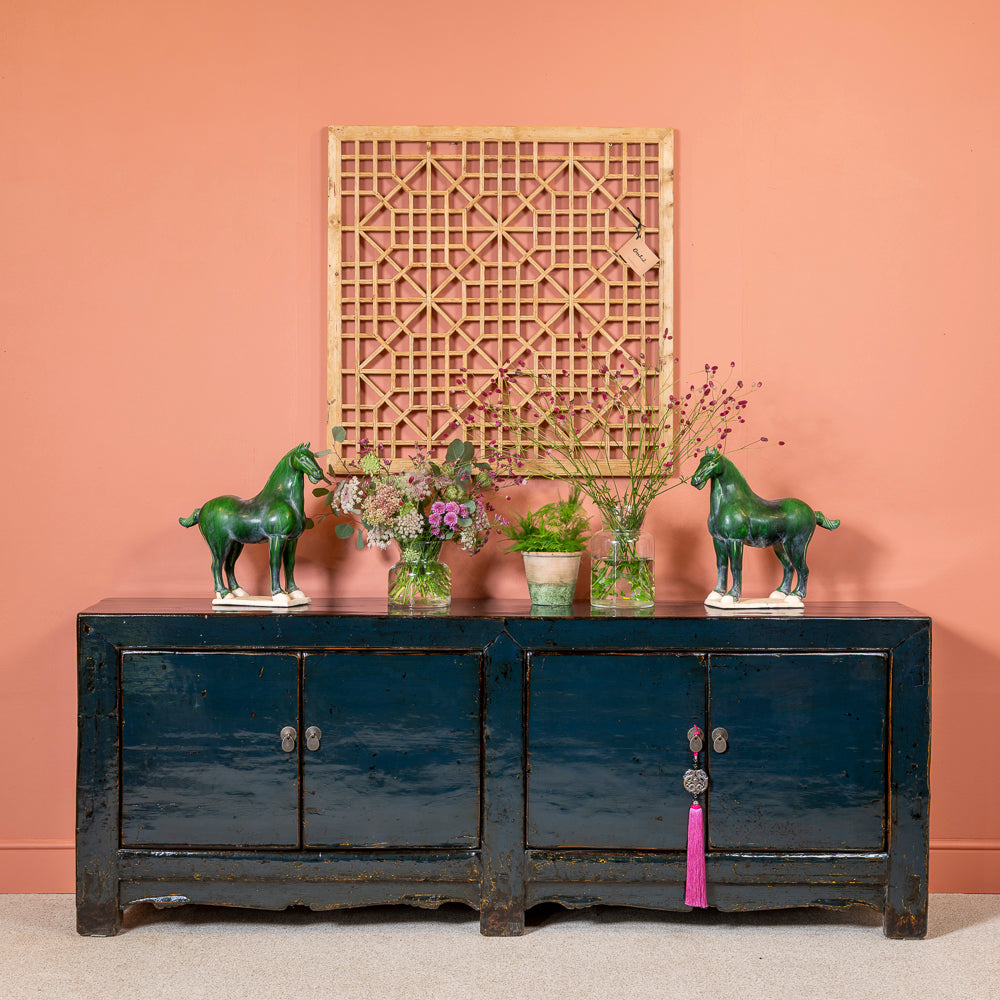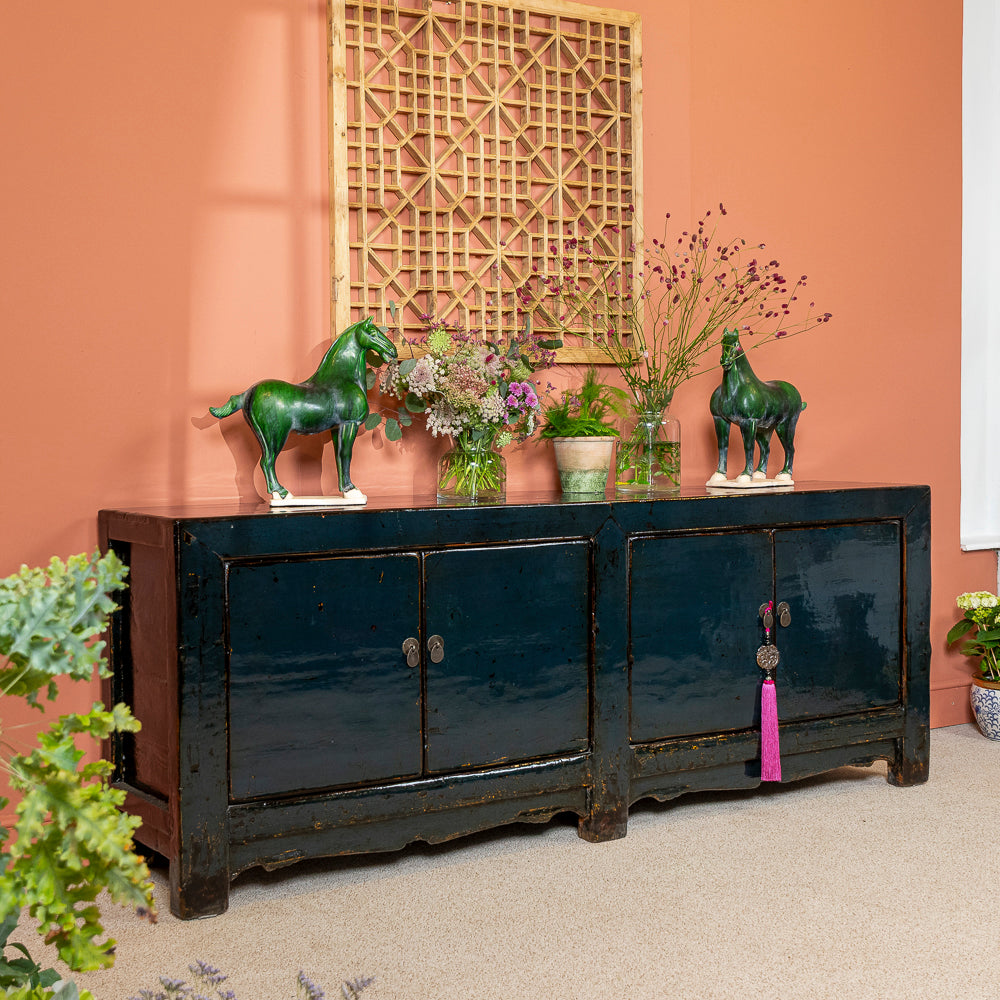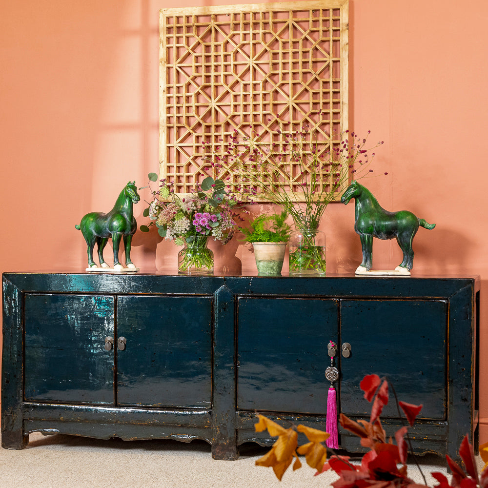 The bold indigo lacquer works beautifully in a range of interiors. It pairs effortlessly with soft neutrals like white, grey, and taupe for a calm, balanced look, or with warm woods, brass accents, and rich greens for a more dramatic and layered feel. Whether styled as a media unit, a hallway centrepiece, or storage in a dining or living room, this piece adds both functionality and refined oriental charm to any setting.