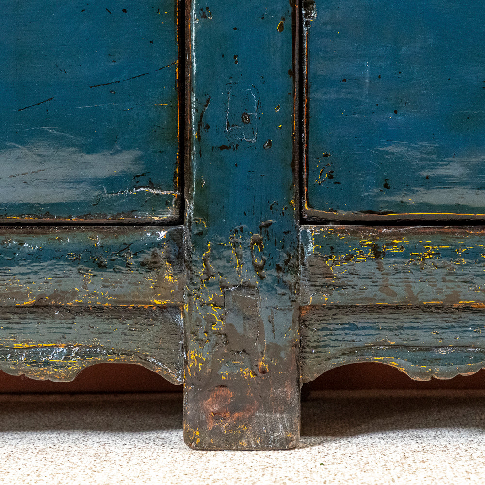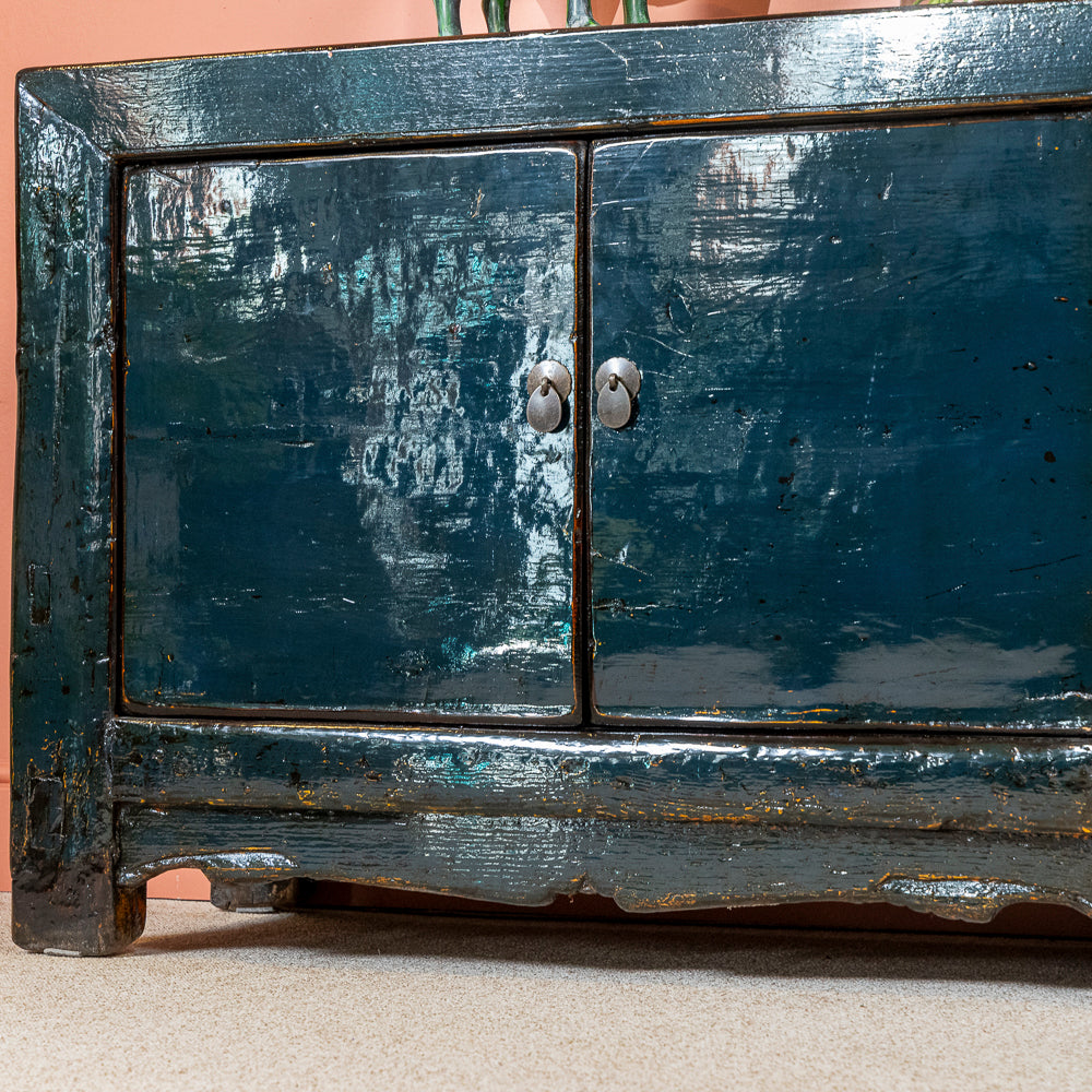 This striking antique Chinese sideboard, handcrafted in Gansu province around 1920, features a rich, deep indigo lacquer finish that brings a sense of depth and quiet sophistication to any space. The slightly distressed surface reveals subtle character and age, while the clean lines and classic proportions reflect the timeless elegance of traditional Chinese design.
