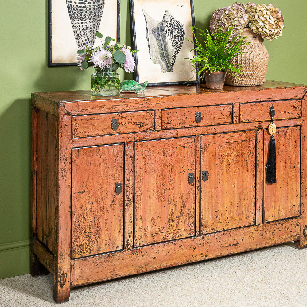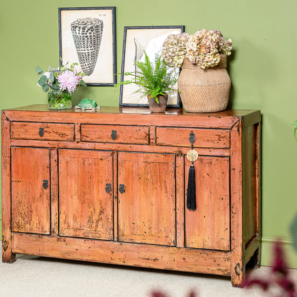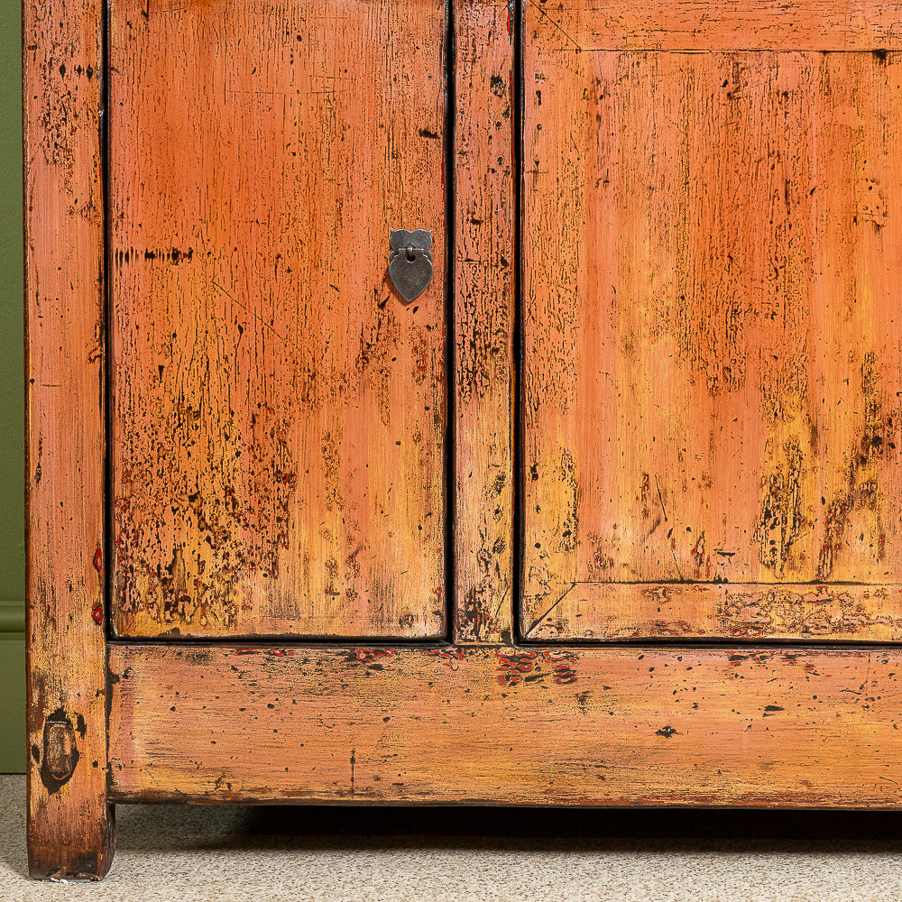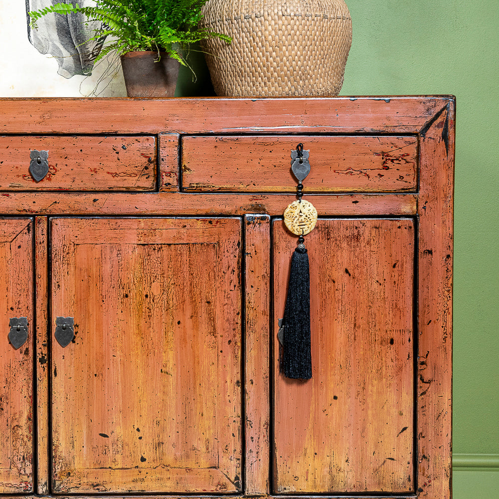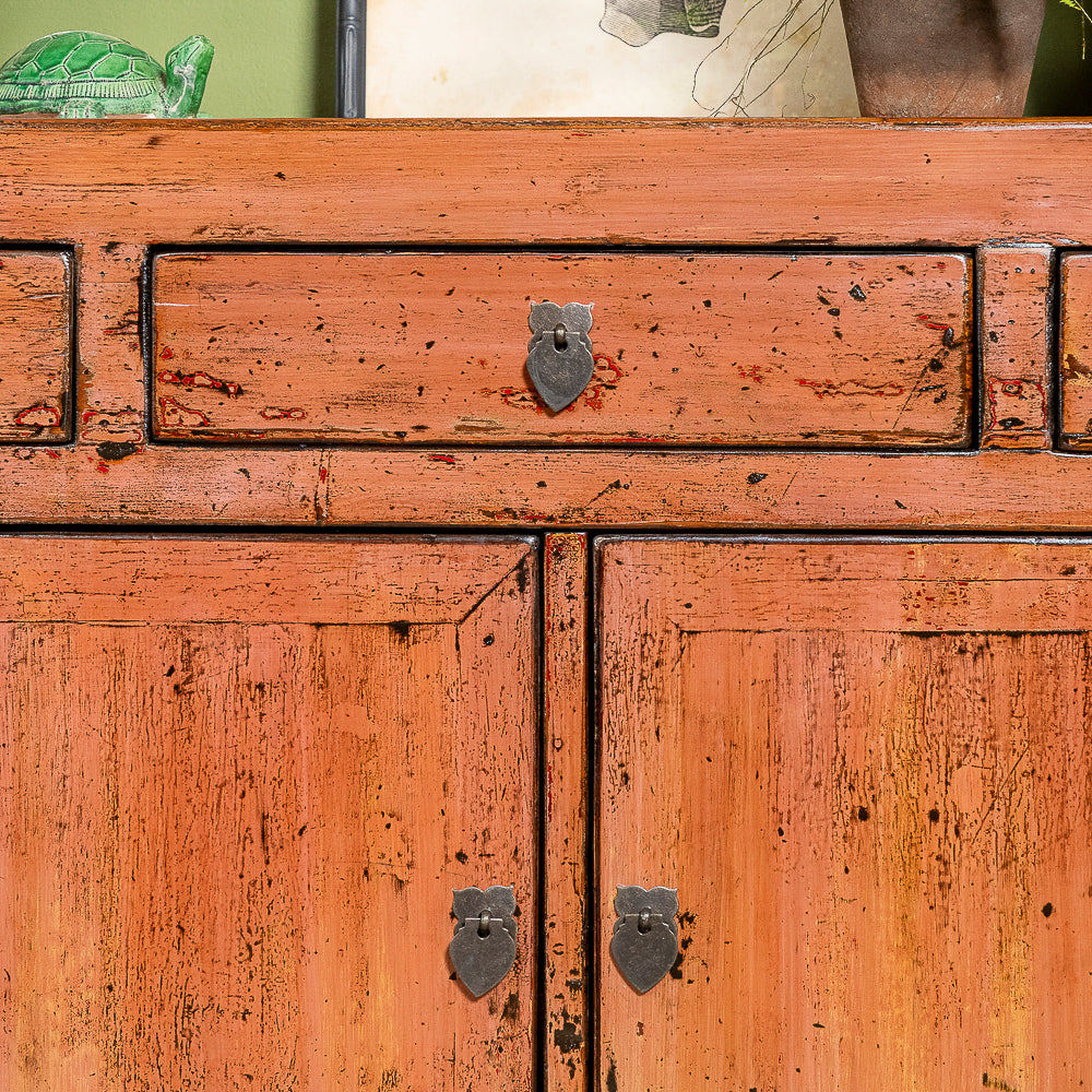 The MEILING Chinese Antique Sideboard is a refined vintage piece originating from Dongbei province and dating to around 1920. The colour is a warm, time-softened blend of coral, terracotta, and dusky rose tones — beautifully mellowed by age and patina. The finish has depth, with subtle variations from soft peach and salmon to muted burnt orange, giving it a tactile, sun-faded look..