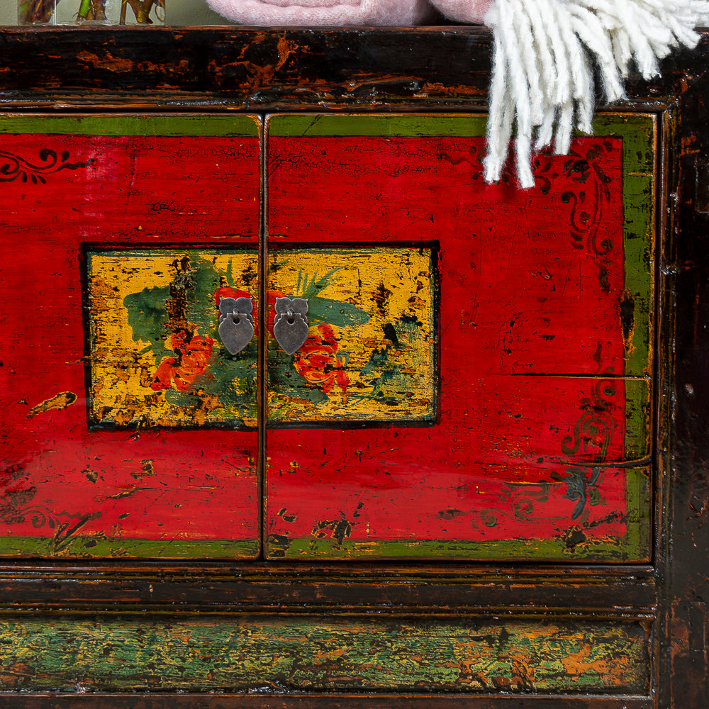 The HUATING oriental antique cabinet, crafted around 1920, is a striking Chinese original from the Shandong province. With its bold red lacquer panels framed by green and black accents, this piece is a celebration of vibrant colour and hand-painted detail. The central section features a floral motif set on a distressed golden-yellow panel, creating a captivating contrast and adding warmth and charm to the overall design.
