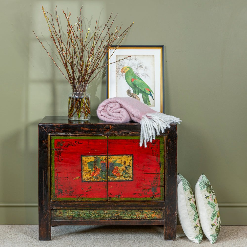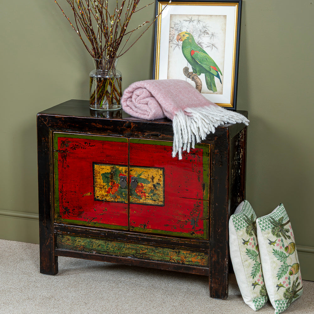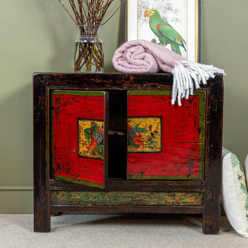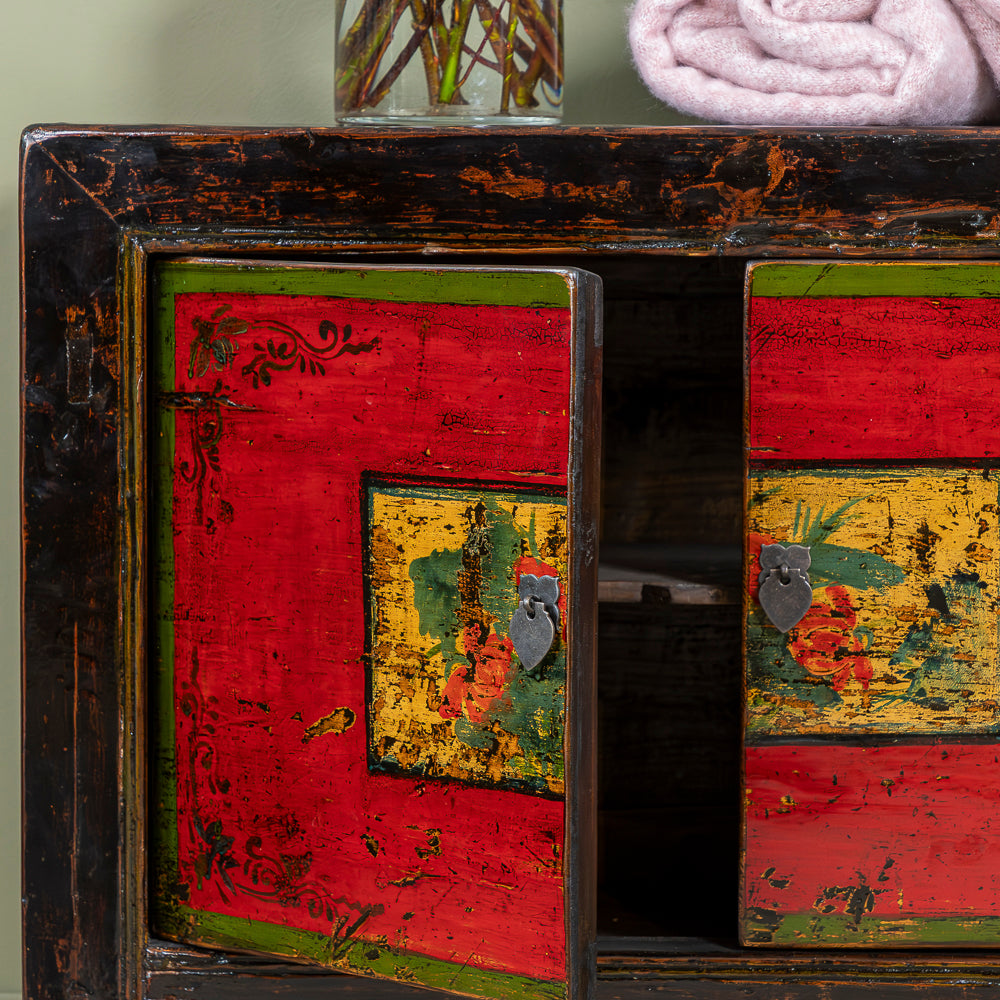 This one-of-a-kind antique Chinese cabinet offers practical storage with a removable internal shelf, ideal for use in a living room, hallway or bedroom. The flat top also makes it a suitable height for a basin, offering the potential to transform it into a distinctive vanity unit. Its vivid colours and rich patina create a focal point while the solid wood frame ensures long-lasting durability.