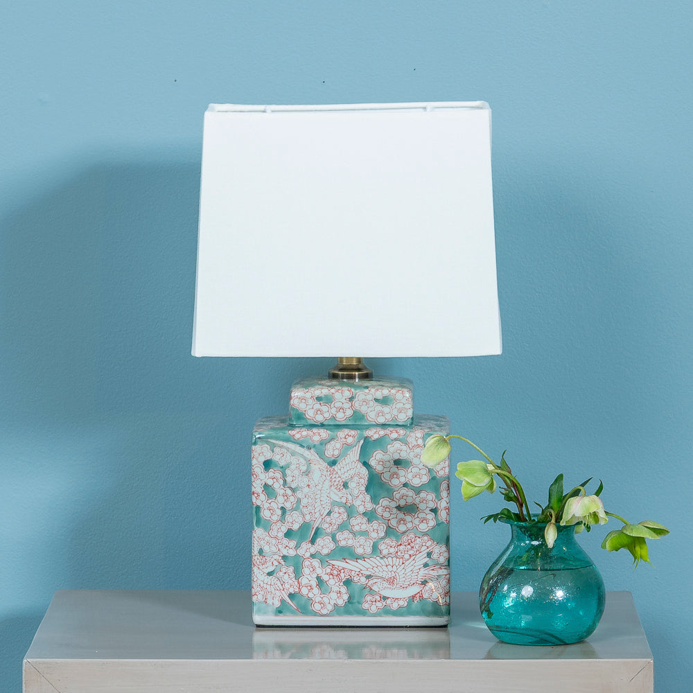 This lovely lamp features a porcelain base hand-decorated with beautiful cherry blossoms and birds. It’s the perfect way to add a touch of life to any room in your home.