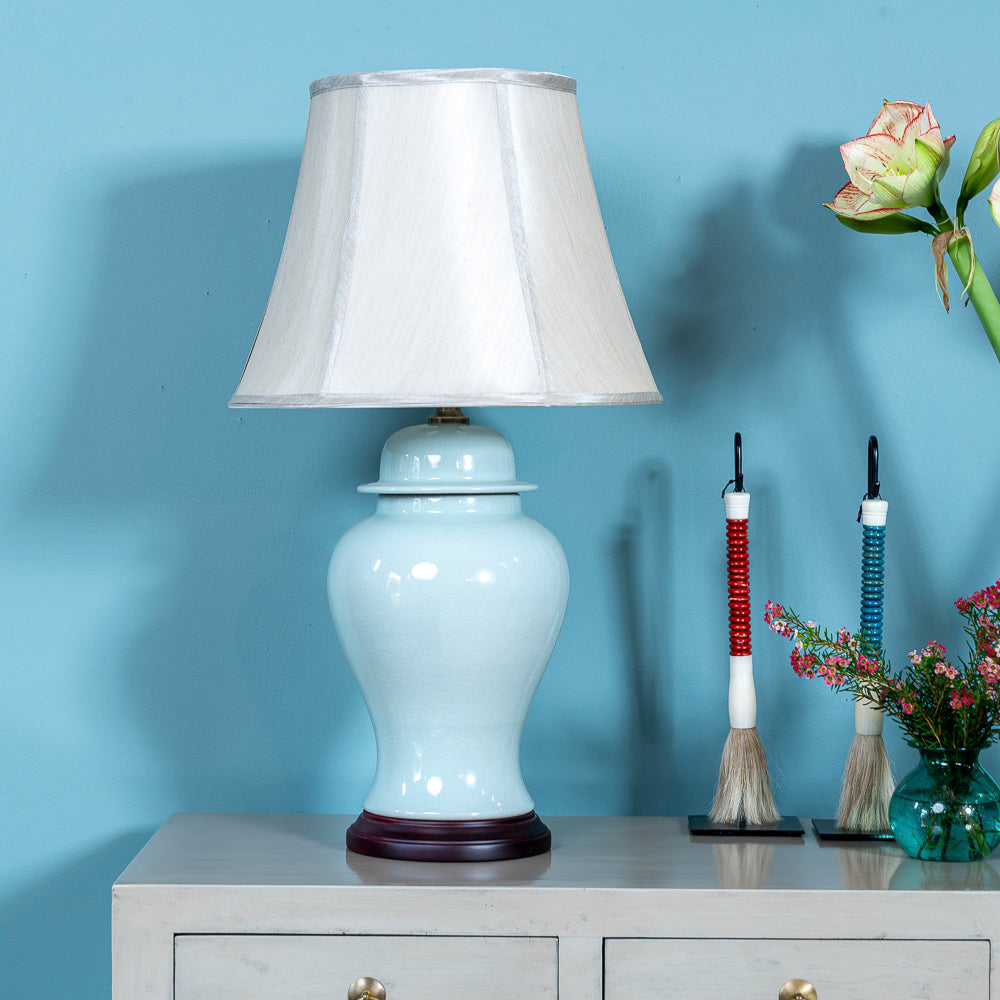 Elevate your space with the timeless elegance of the QINGCI Celadon Oriental Porcelain Lamp. Crafted in a light celadon color and adorned with a beautiful crackle glaze finish, this lamp exudes understated sophistication. It rests on a dark wooden base, providing a rich contrast to the delicate porcelain. The fully lined neutral silk shade enhances its classic appeal, making it the perfect addition to any room.