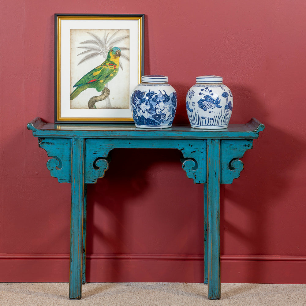 The classic narrow form and upward-sweeping ends reflect the elegance of traditional Chinese craftsmanship. Decorative carved spandrels add softness to the structure and showcase skilled joinery. The rich turquoise tones add vibrancy and freshness to a space, perfect for lifting neutral palettes or balancing darker woods. This is a piece that brings both colour and calm, wherever it’s placed.