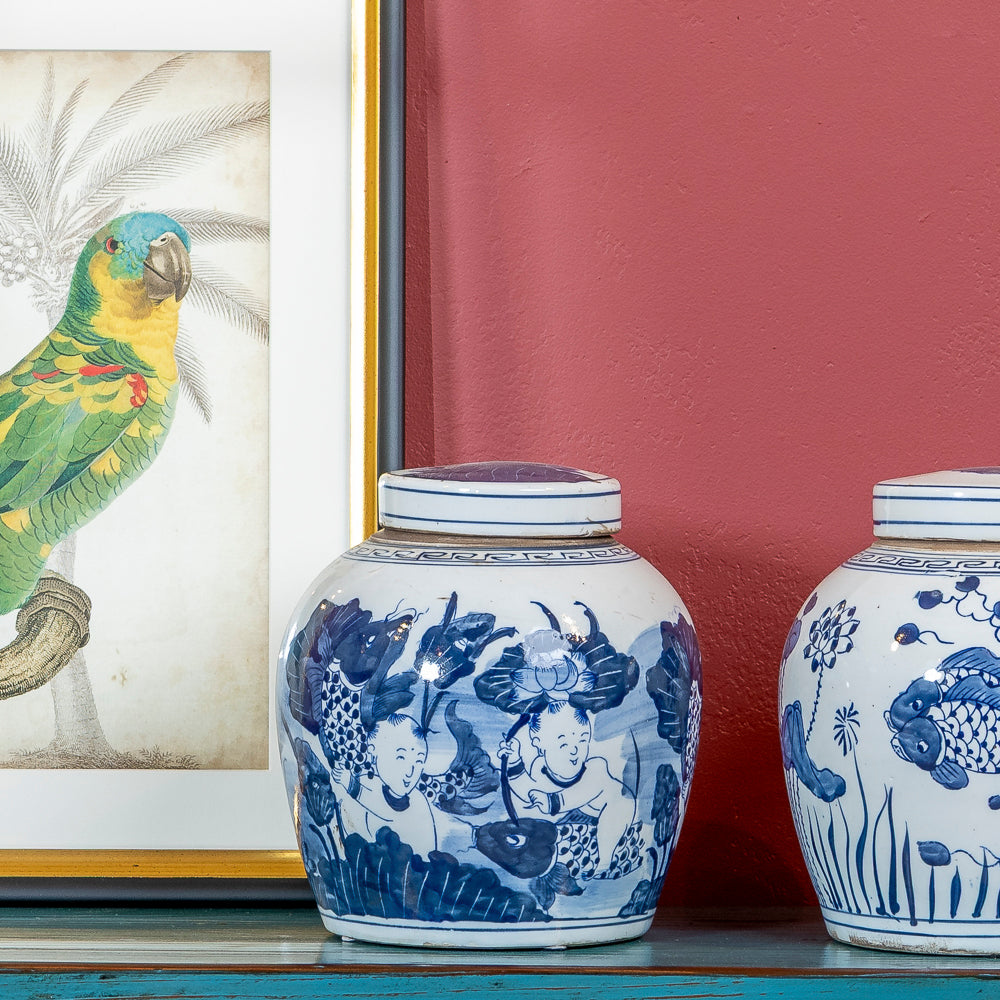 Looking for a way to add some delight to your home décor? Check out our charming ginger jars! These handcrafted Chinese blue and white jars are each unique, with beautiful handpainted details. Our ginger jars depict happy children playing and interacting with large koi fish in a pond, surrounded by lily pads.