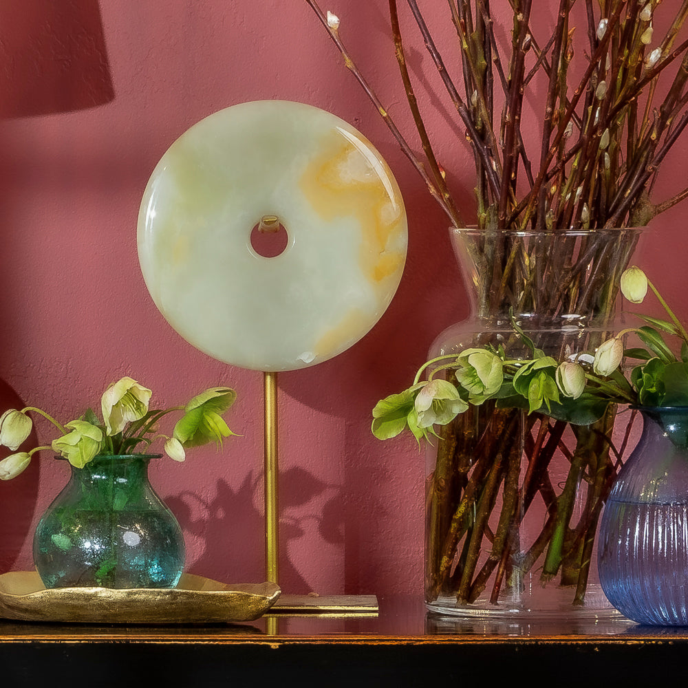 Transform your living space with our exquisite MUNIAN Natural Stone Disc. Crafted from natural stone and complemented by a durable gold metal stand, this decorative piece evokes a sense of wonder and serves as a captivating focal point.