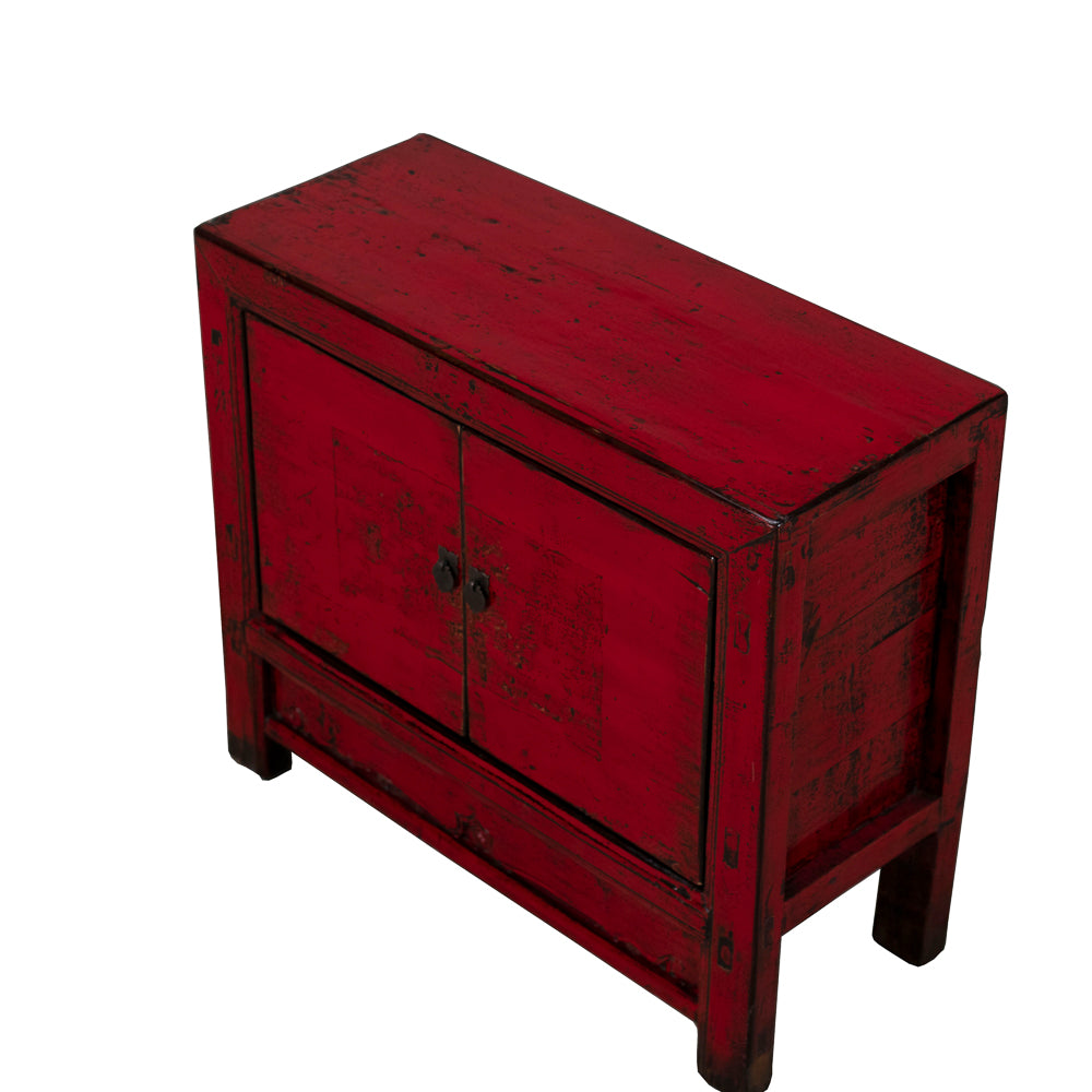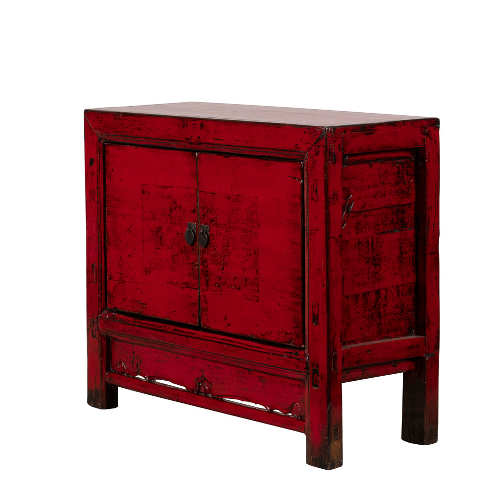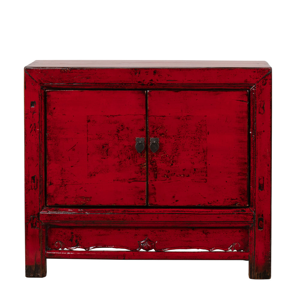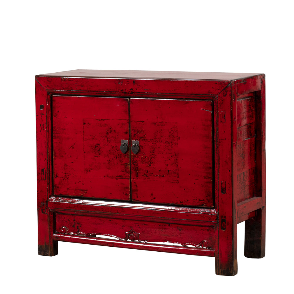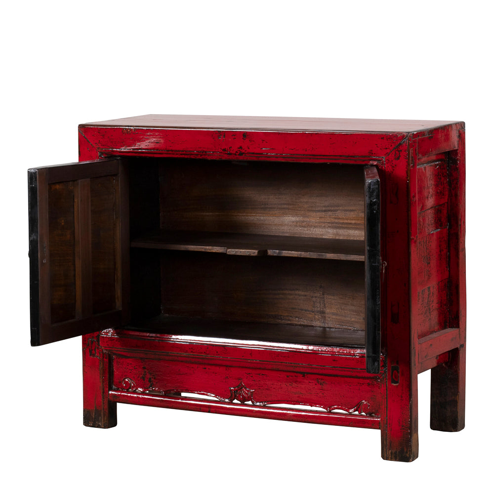 Behind the double doors, a spacious cupboard with internal shelving provides practical storage for everyday living. The compact proportions make it ideal as a bedside cabinet, side table, or accent piece. Traditional metal hardware and the carved apron detail complete the design, bringing together bold colour with classic Chinese craftsmanship.