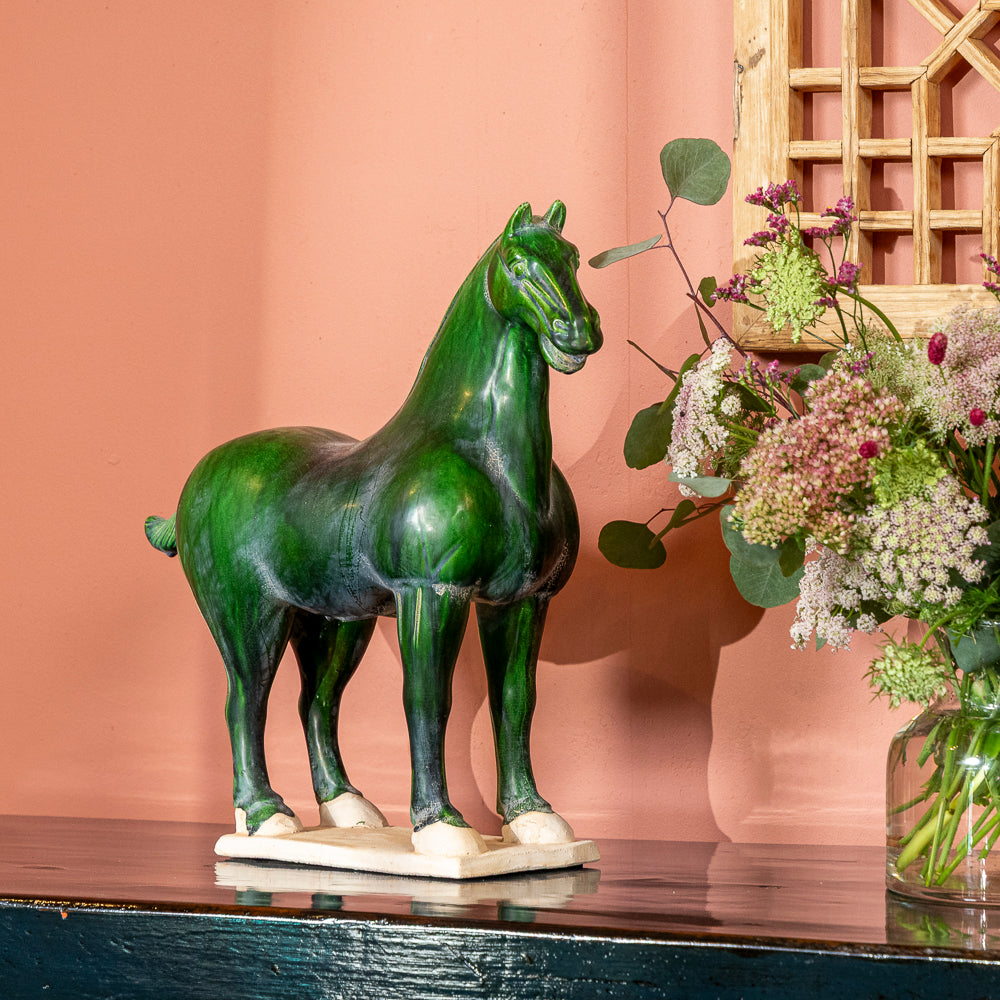 This stunning Chinese ceramic horse brings the elegance and history of ancient Chinese art into your home. Handcrafted with intricate detail, this sculpture captures the iconic form of the Tang Dynasty horse, known for its strength, grace, and stature. The deep green glaze highlights the flowing lines and lifelike posture of the horse, a symbol of power and prestige in ancient China.